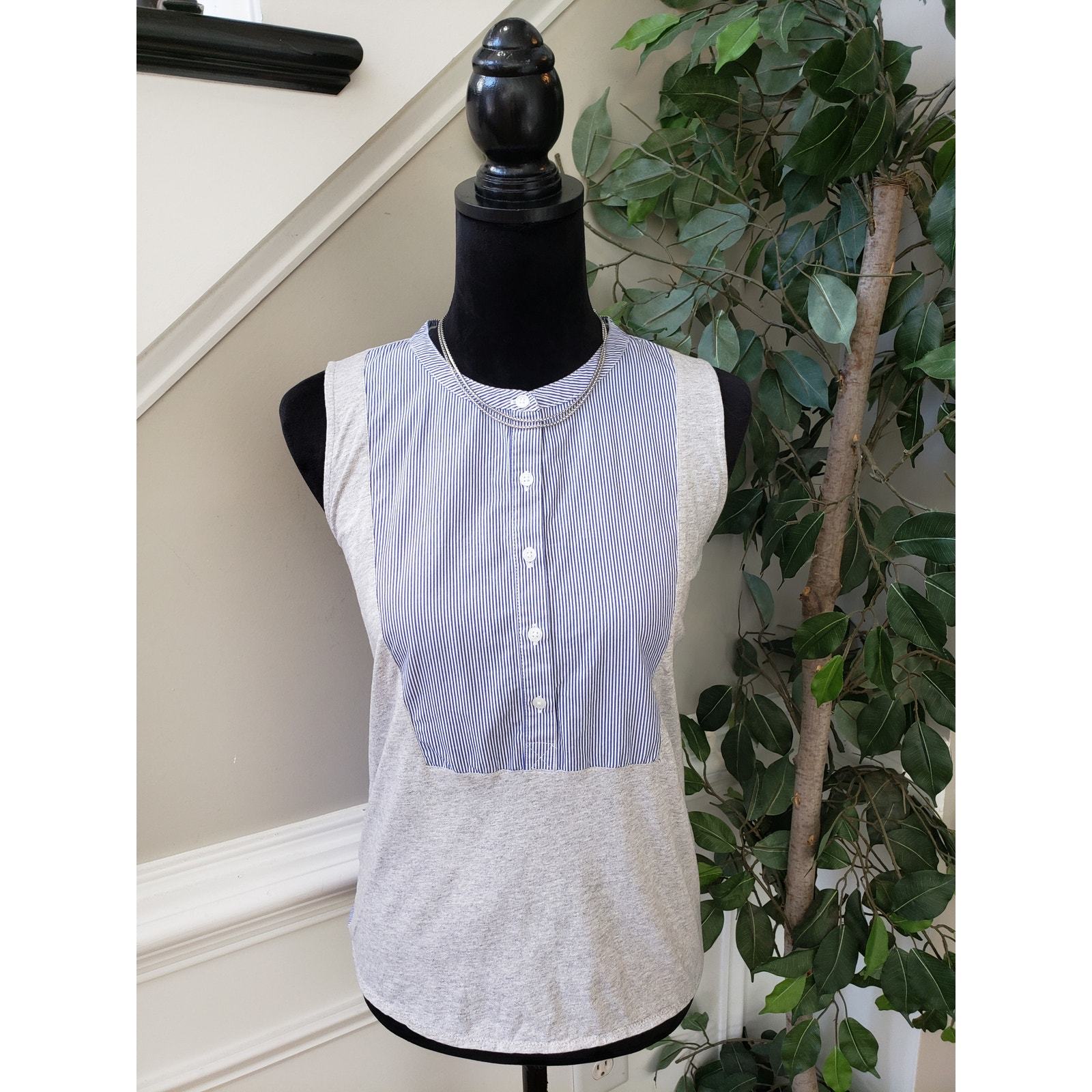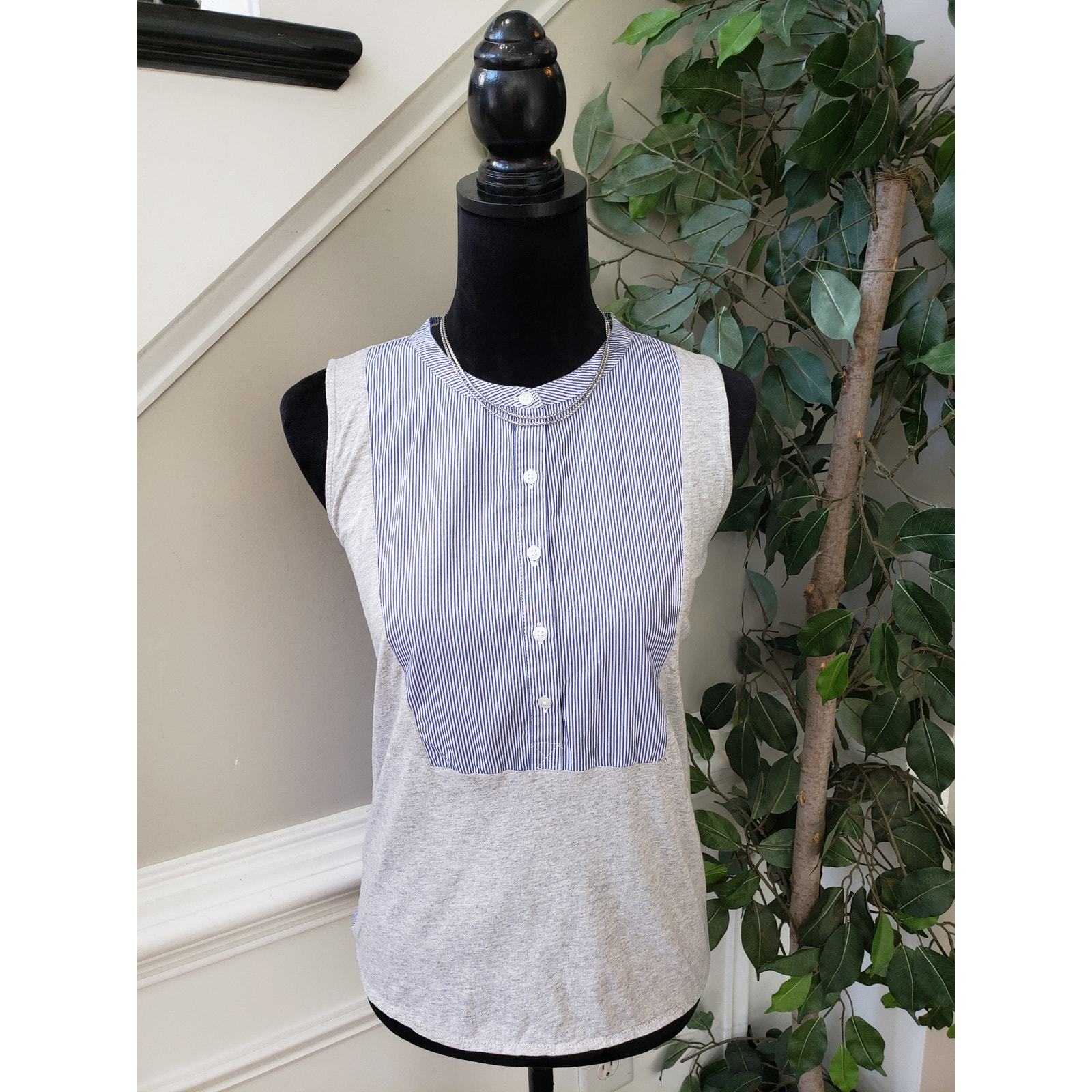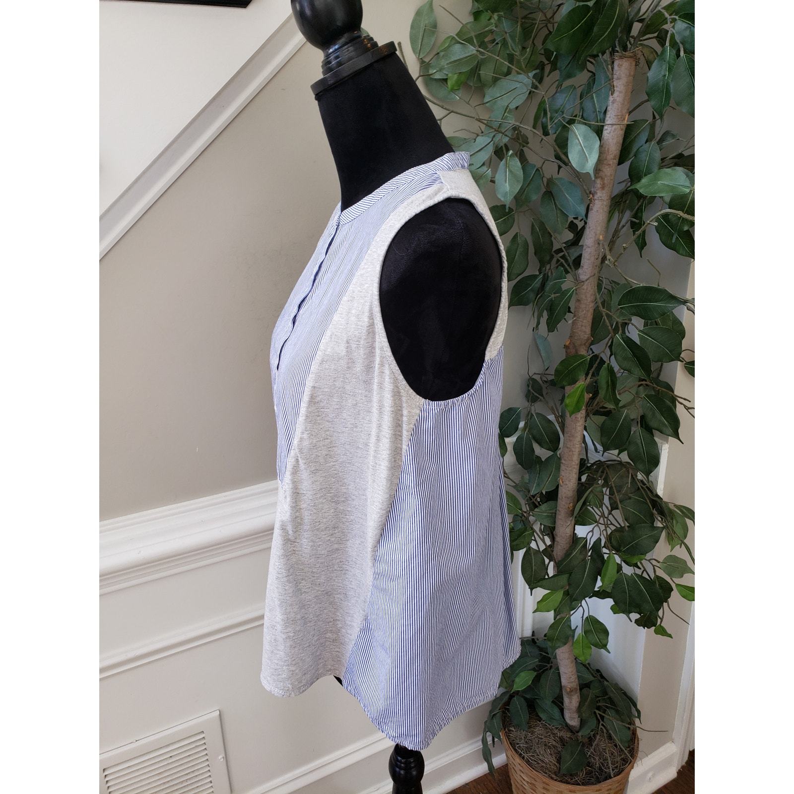 J. CREW Jersey Mixed Media Henley Tank Top Women M Blue Gray Stripe Button Front
