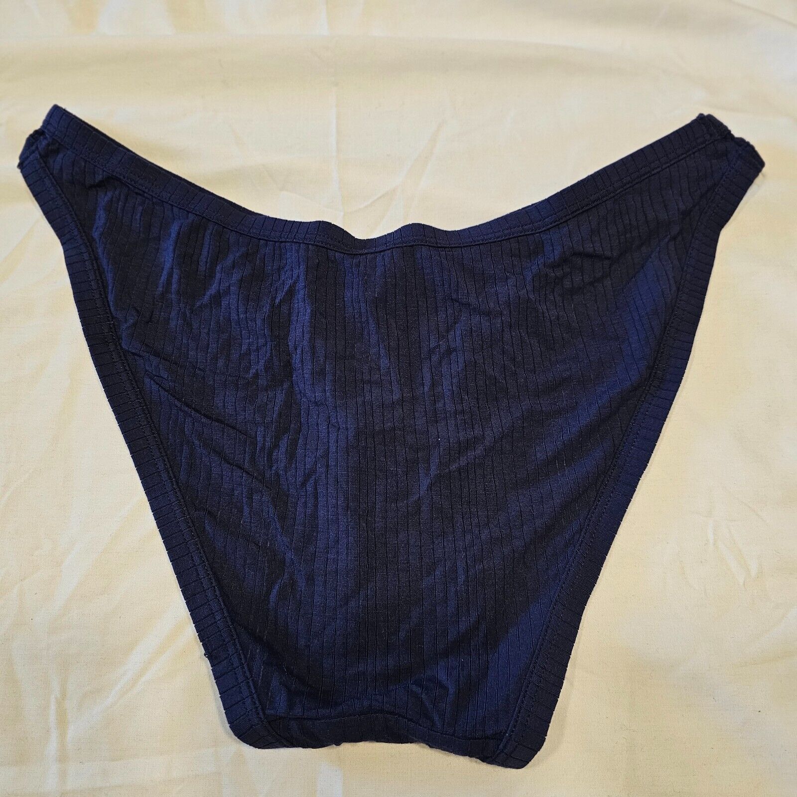 American Eagle Aerie Hi Cut Bikini Panties LARGE Navy W Lines Stretchy Silky