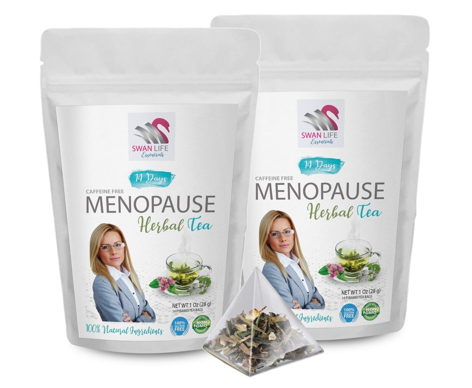 SWAN LIFE ESSENTIALS - MENOPAUSE HERBAL TEA FORMULA: If you are looking for natural menopause relief, our herbal tea may be a healthy option. The blend is combined with Black cohosh root, gingko leaf, red clover herb, cinnamon chip, eleuthero root, licorice root with natural peach flavor.