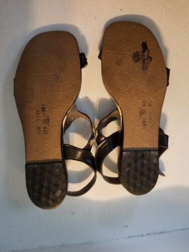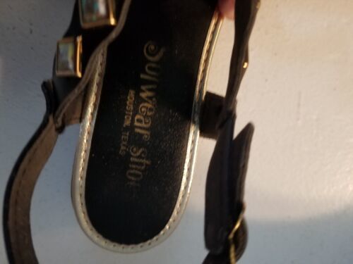 These Vintage MCM 60s Mod Hipster Tiki Solewear Shoes are stylish flat sandals featuring a square toe and strappy design with gemstone accents. They are in a black color, with a faux leather upper and lining. The sandals have an ankle strap with an adjustable buckle closure, making them perfect for parties, casual wear, or summer festivals. Made in the United States, these vegan-friendly shoes are a size 5.5 (US) or 35.5 (EU).