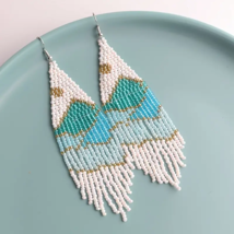 These Boho Vintage Vibe Colorful Beaded Tassel Earrings feature a vibrant multicolor design in white, green, and turquoise hues.