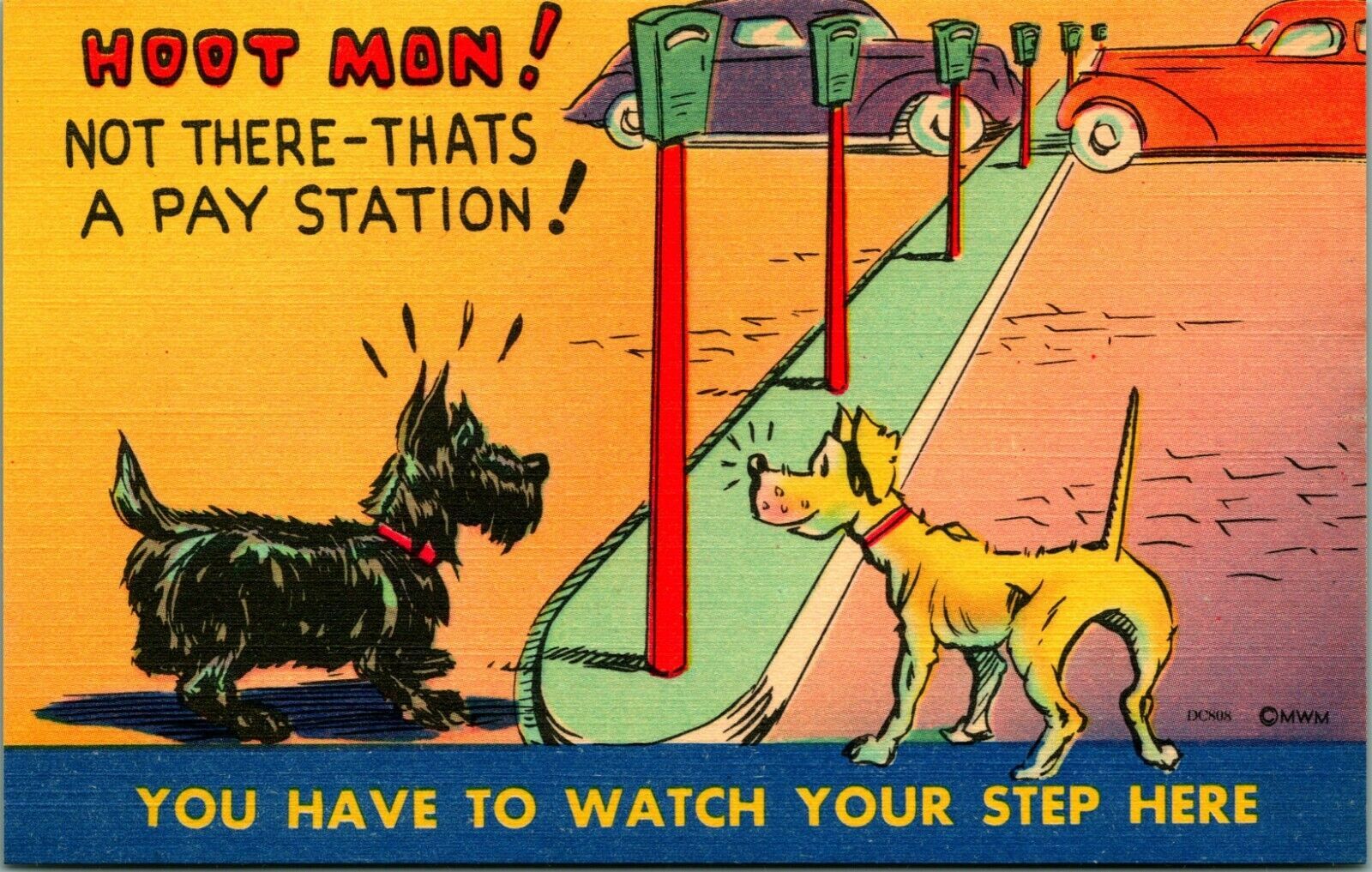 Comic Two Dogs Hoot Man Not There Pay Station Watch Your Step Linen Postcard