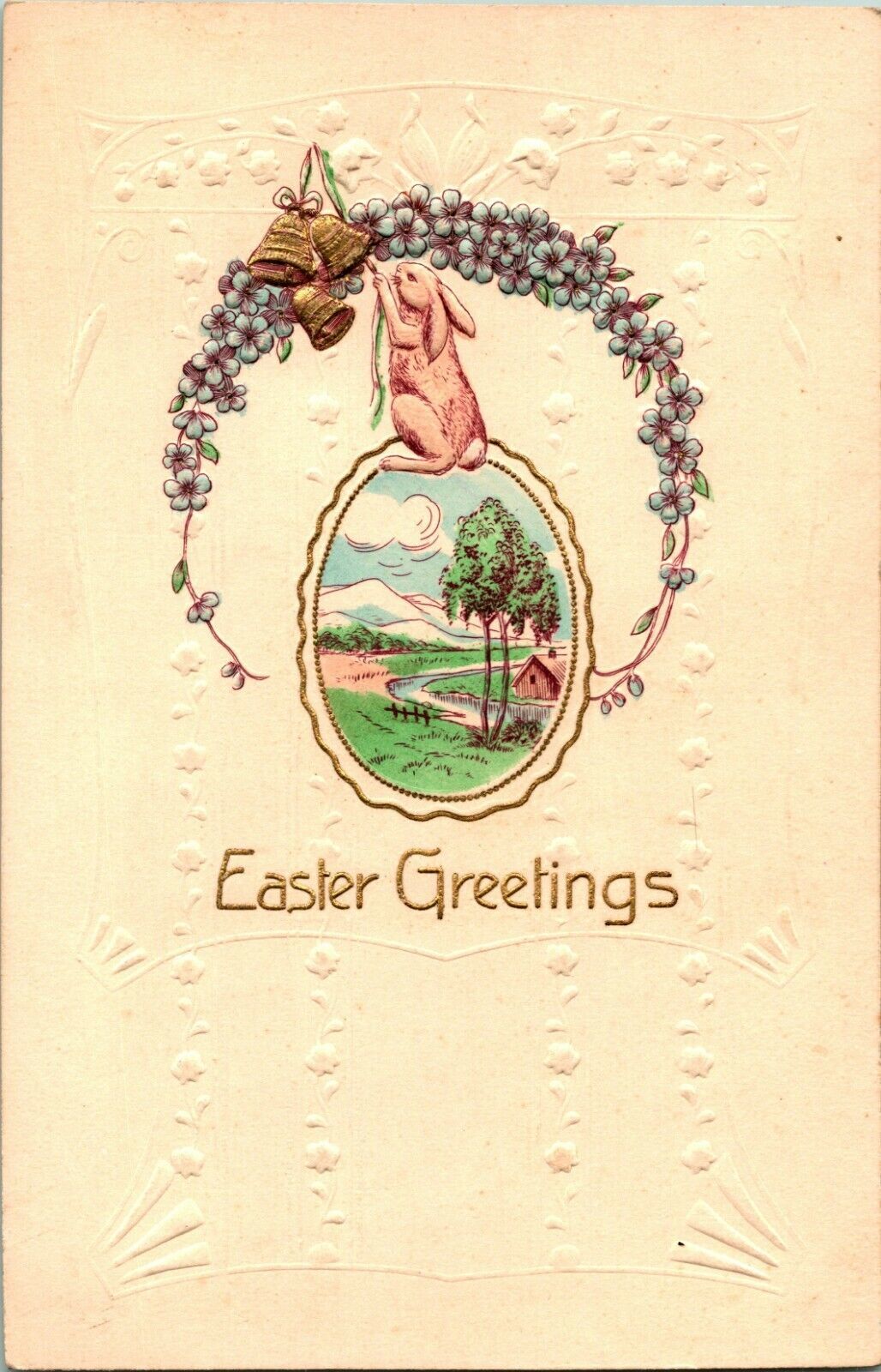 Vtg Postcard 1910s Easter Greetings Embossed Bunny Flower Wreath Bells Unused