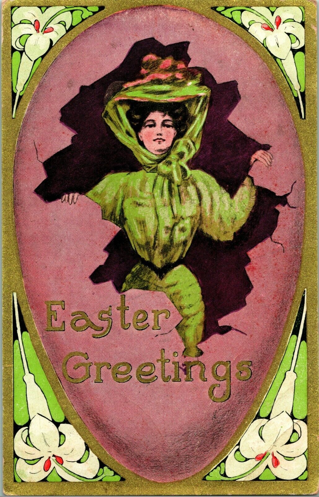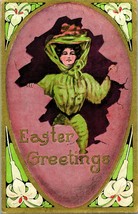 Vtg Postcard 1909 Easter Greetings Giant Egg Gilt Woman In Green Big Hat