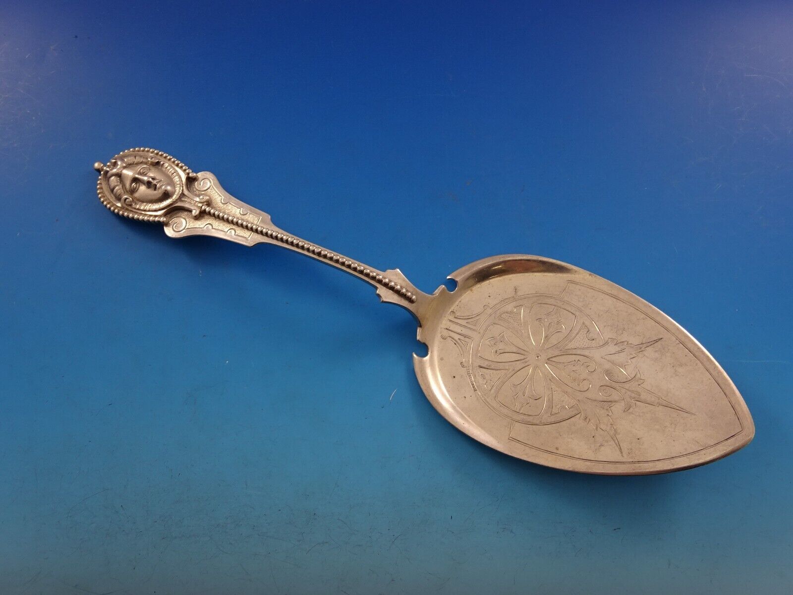 Beautiful Coin silver flat handle Pie Server 10 3/8" with Medallion by Wood Hughes, circa 1860's. This piece features a high relief beaded design up the handle to a high relief finely detailed medallion of a woman on the end. The blade features a hand engraved design. It is monogrammed on the reverse (as shown) and is in excellent vintage condition with crisp detail.