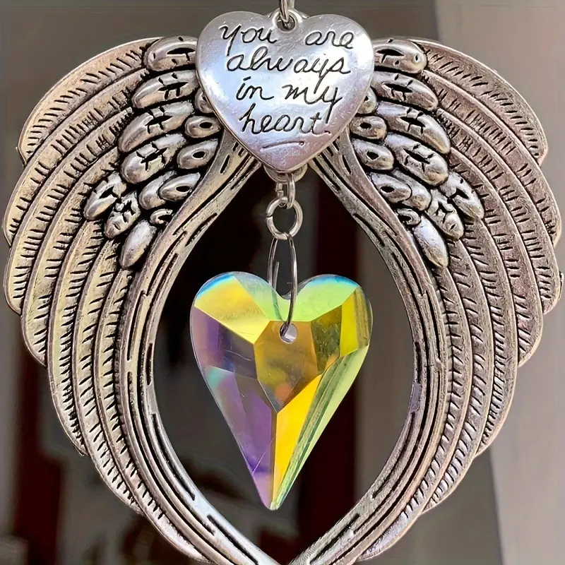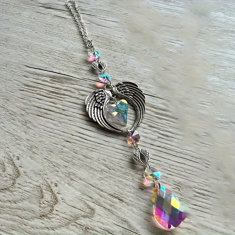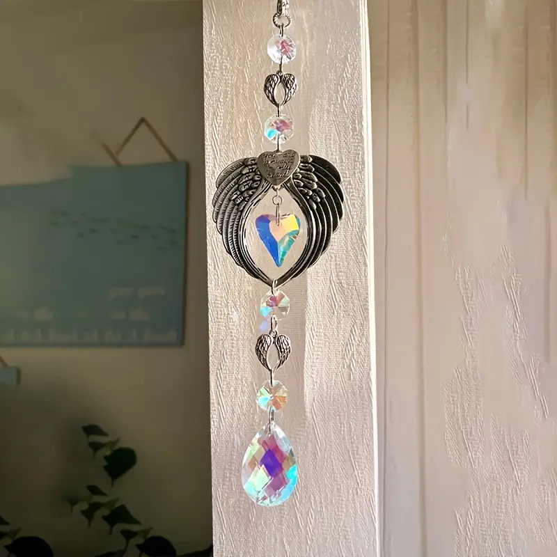 The Guardian Angel Wings Suncatcher is a medium-sized decorative accessory designed to hang in a window and catch the sunlight, creating a beautiful display of colors.