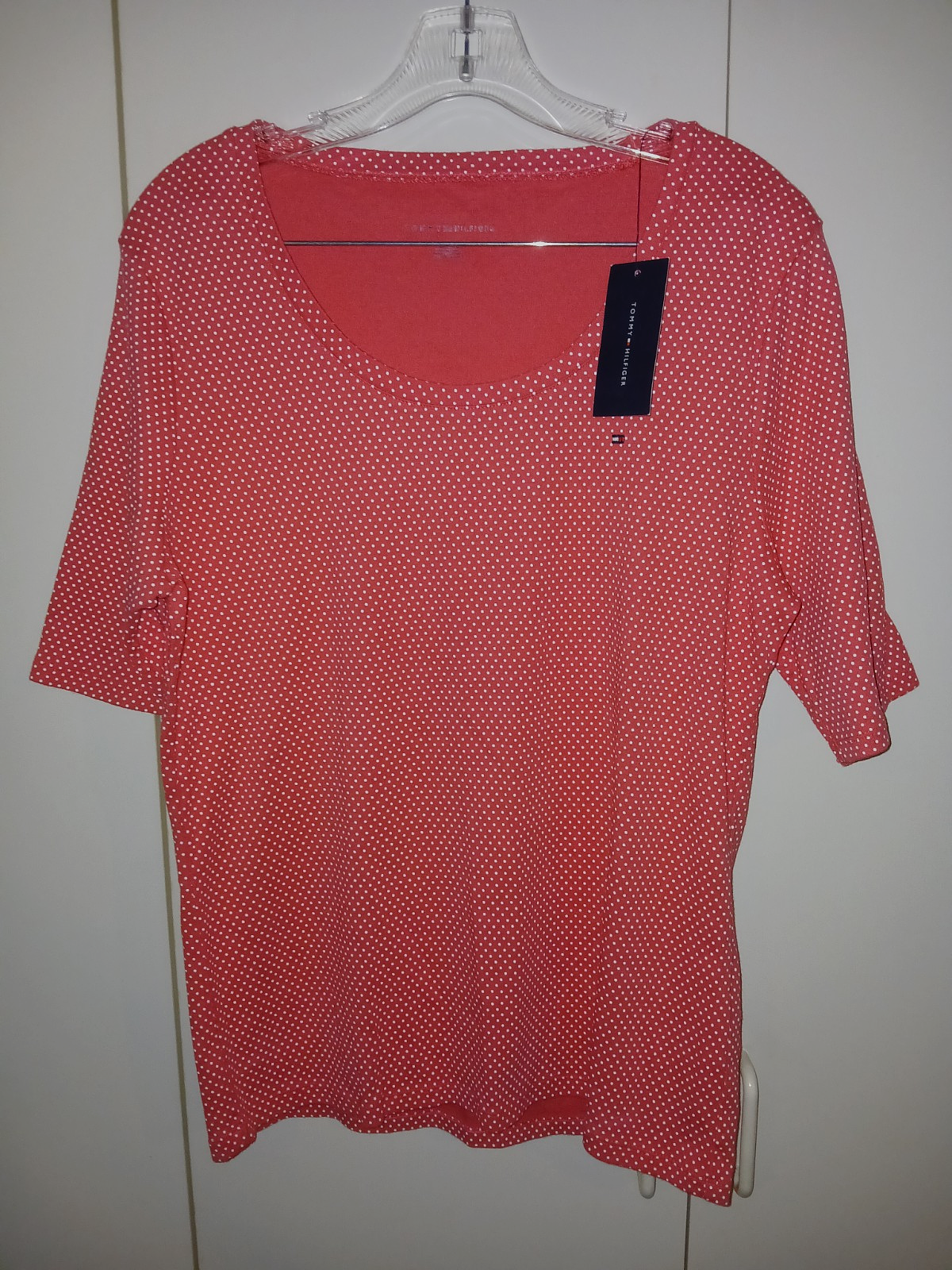 THIS IS A NICE TOMMY HILFIGER LADIES SHORT-SLEEVED PULLOVER KNIT POLK-DOT 100% COTTON TOP IN A SIZE XL. IT IS NEW, WITH TAGS ATTACHED AND PRICE TAG OF $29.50.