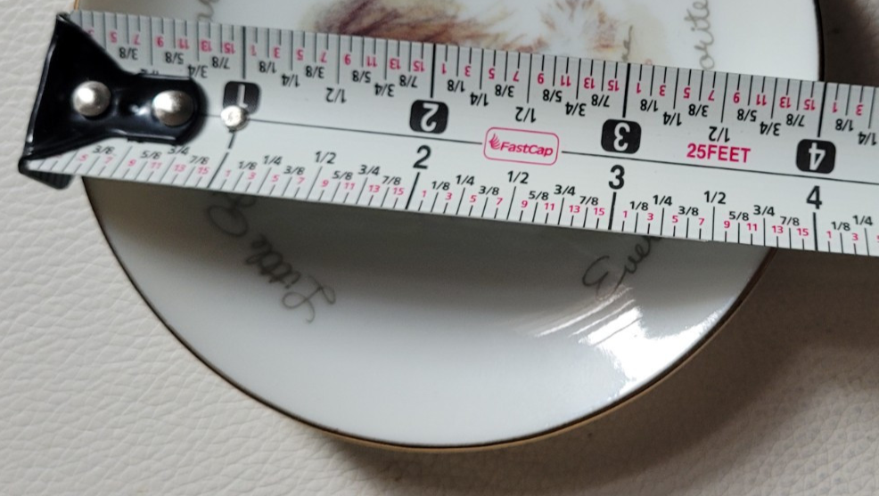 This 4 inch round plate is in good used condition. There are no chips or cracks that I found. It would make a nice gift for someone or to decorate a room.