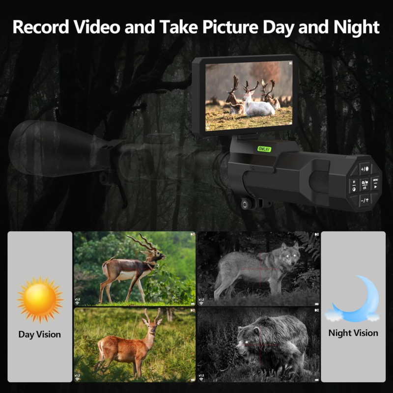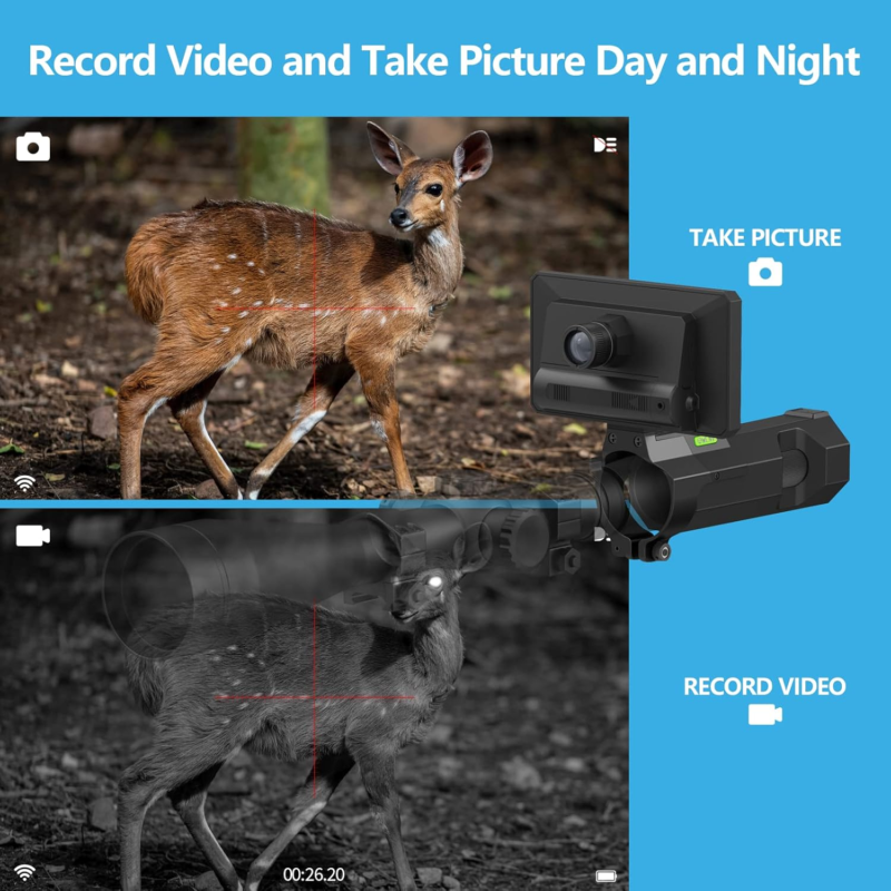 ?HD 1080P Record/Photo Resolution?The hunting night vision scope supports taking HD 1080P photos and recording videos,allows you to have a clear and better resolution image of the target at distances up to 328 yards,when the sun goes down you can just attach the day/night unit to the front of your scope and be ready to go.