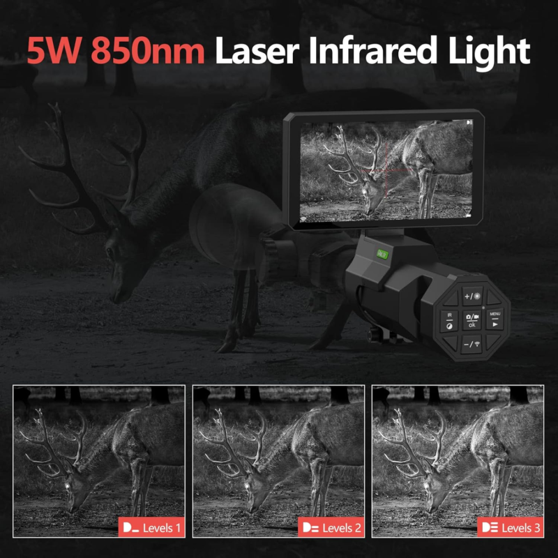 With the large 5? LCD screen on the back of the module makes the night vision rifle scope really easy to view what you are aiming into the dark at once you?ve properly adjusted the camera lens.