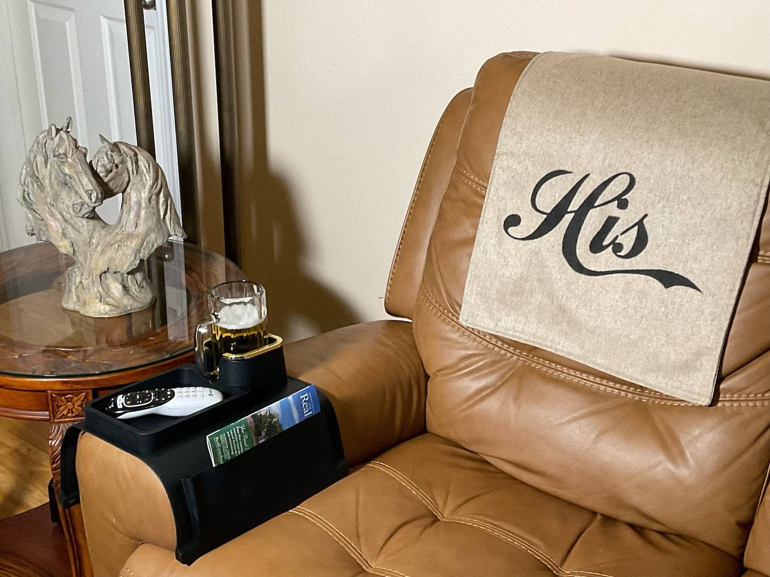 Set of Two Head rest covers for Sofas, Loveseats, RV cover, Recliners, Theater Seats. Made of a durable Polyester cloth with the digital printing words "His or Hers" . Looks Great in any room. Clean with a damp cloth as needed. Come with 2 plastic nail head tacks to secure it to your furniture if needed. See the other color selections. Cup holders sold separately.