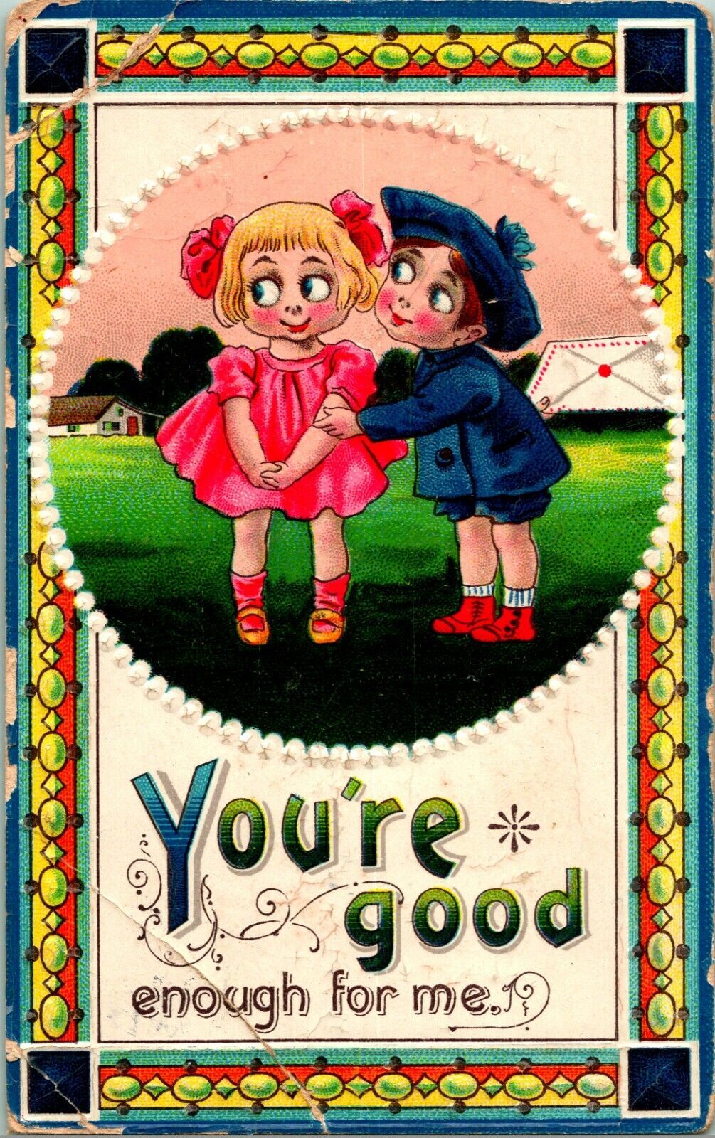 Vintage 1913 Postcard Cartoon romance "You're Good Enough For Me" EmbossedNormal wear associated with an old postcard it might have creases, a corner bump, ink on the front, etc. See picture for a depiction of condition and feel free to ask any questions. This card has above average wear.