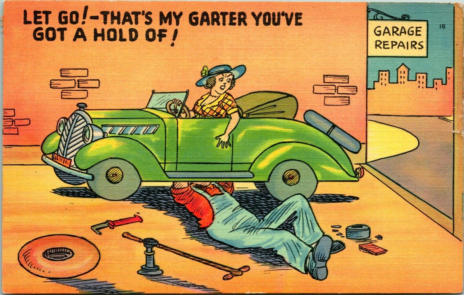 Vtg Linen Postcard Comic Let Go! That's My Garter You'e Got a Hold Of! Mechanic