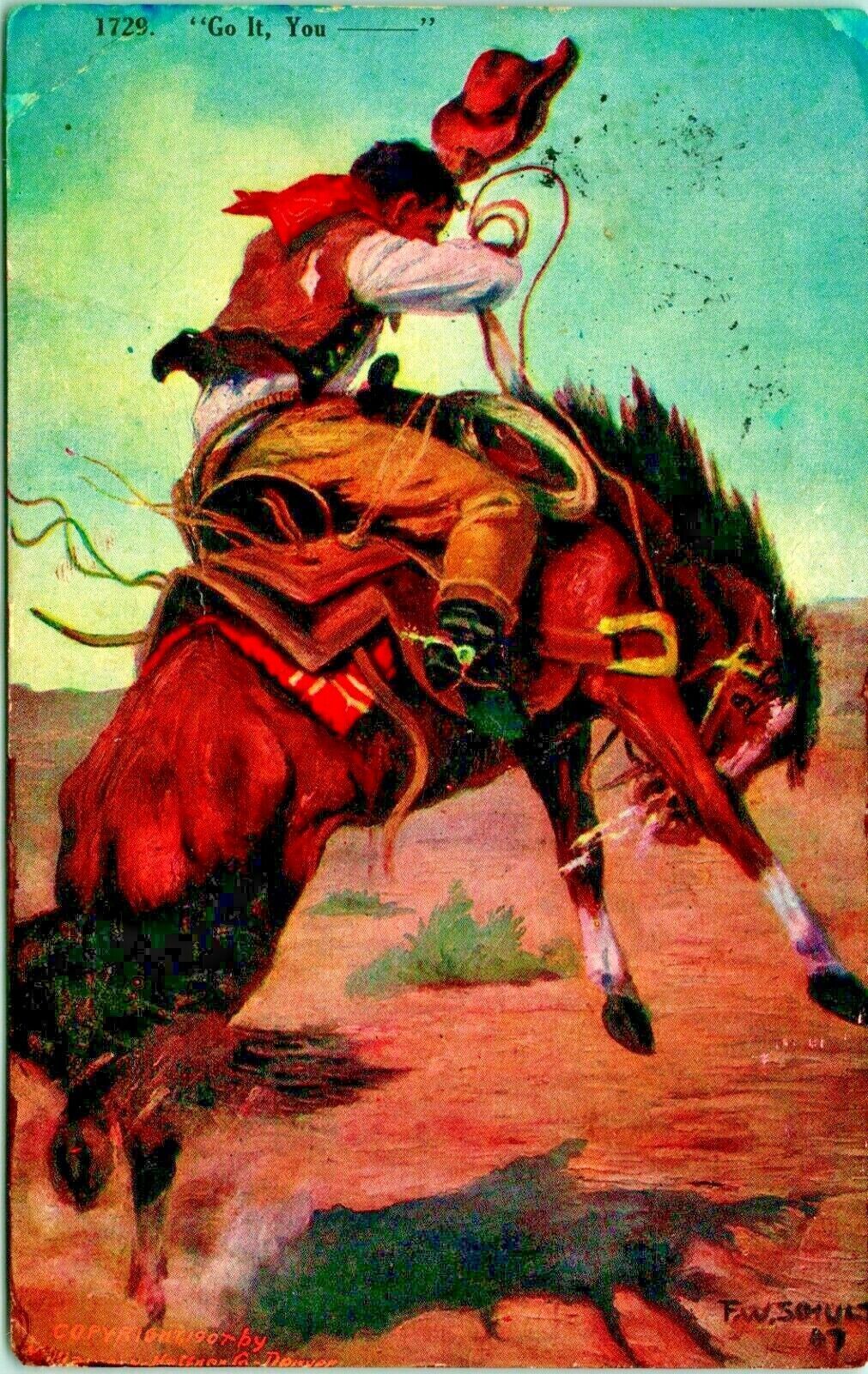 Artist Signed F W Schultz Cowboy Bucking Bronco Keep Your Seat 1910s DB Postcard