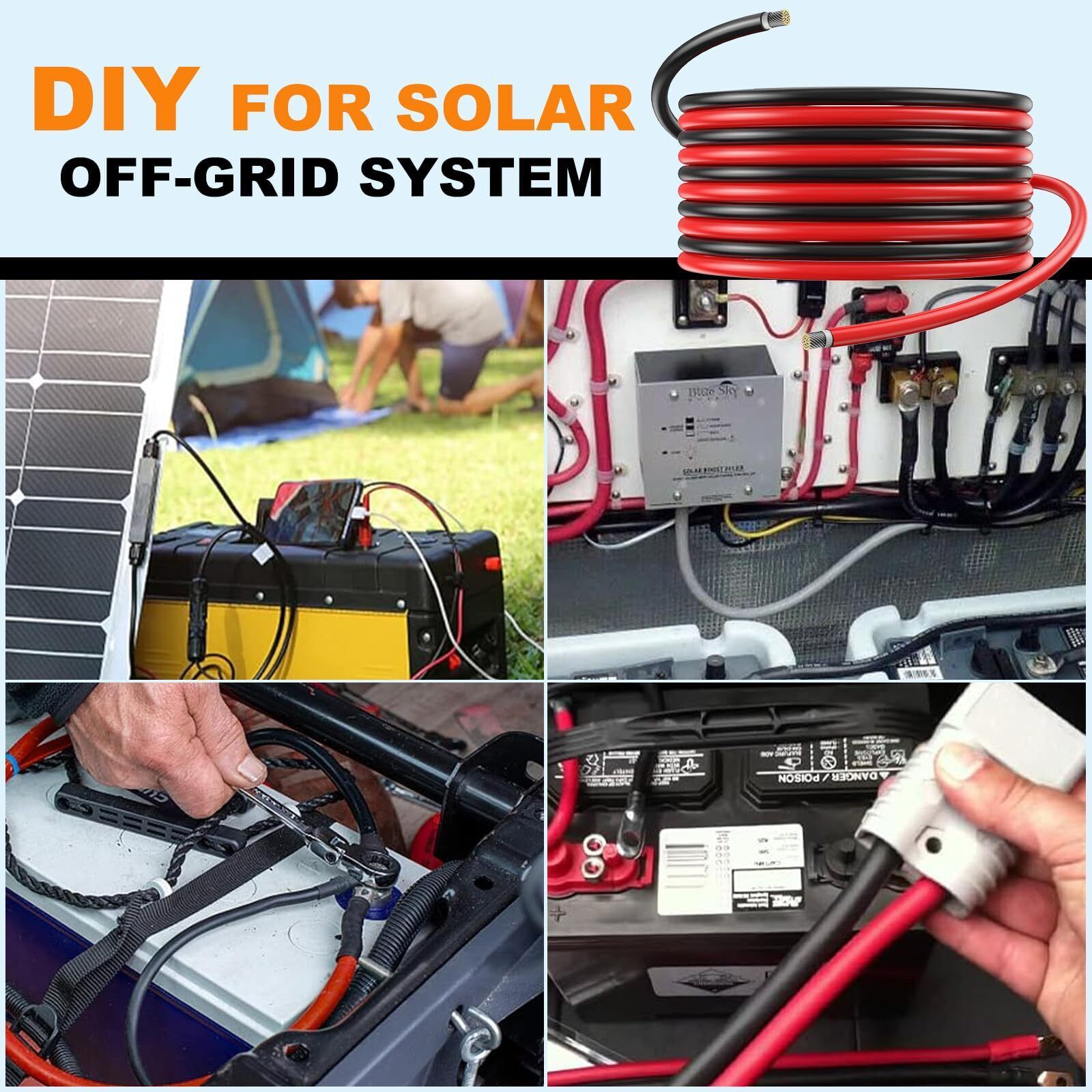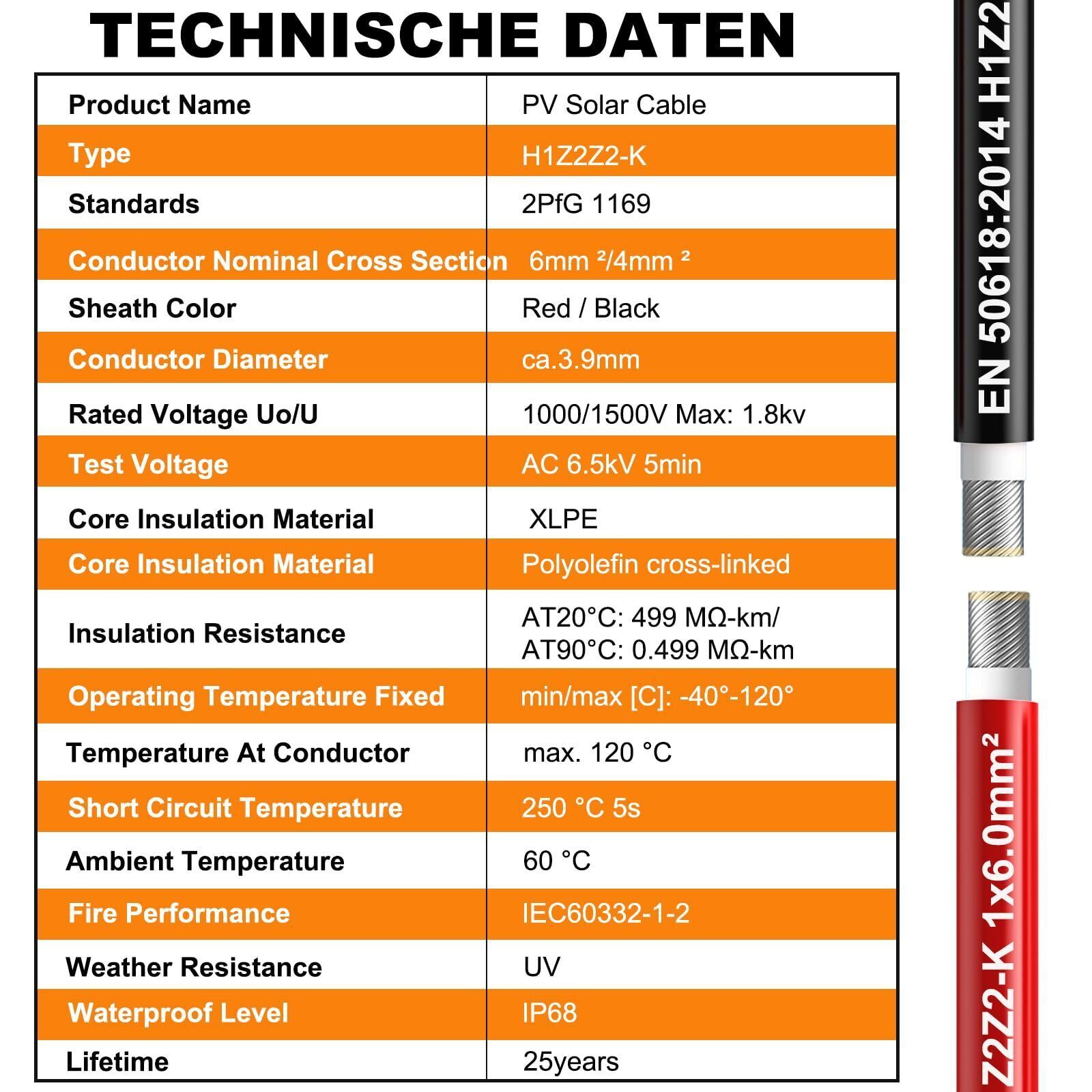 ?????? ?????: The 10AWG solar panel extension cable kit is a combination of a black 30m/ 100ft solar cable and a red 30M/ 100ft solar wire, enough length for you to DIY the connection in your solar system. Generally, the 10AWG solar cable is the maximum diameter for solar panel cables, thick and durable. Using this diameter solar extension cable can provide your equipment with stable current and faster transmission speed, effectively reducing power loss. ??????? ?????? ?????: The solar panel cable is made of tin plated conductive copper material, 84 strands 0.295 mm tinned copper wire are inside each 10 gauge wire, has better conductivity, thermal conductivity, and corrosion resistance than other common materials, extra-thick insulation can withstand extreme heat and cold -40?-194?(-40?-90?). Designed for Extreme Weather, It can be buried directly in the ground. ????????????? ???????????? ????? ?????: This solar panel extension cable meets TUV standards for photovoltaic solar applications and can be used in a variety of environments to ensure circuit safety. Cross-sectional area: 6mm, temperature range: environment -40C-90C, test voltage: 6500V, rated voltage: DC1500V, conductor resistance: (20C) ??5.09?/KM, weather resistance: UV, rated current: 57A. ????? ???????????: The IP68 level of waterproofing allows the solar panel wire to work outdoors for a long time (over 25 years), The solar wire outer layer consists of XPLE materials, which can protect the wires from wear and chemical corrosion, built-in insulation protection layer to prevent the risk of electric shock, flame retardant and prevent fire. It ensures reliable and efficient power transmission even in harsh environments such as rain, snow and wind. ??? ??? ????? ?????: The 10 gauge copper wire allow for more space to be extended between the solar panels and the charge controllers, easy to solder and cut, which is widely used for wiring various low-voltage electronic devices, including solar panels, DC circuits, ships, ships, automobiles, RVs, LEDs, and inverter wiring etc.