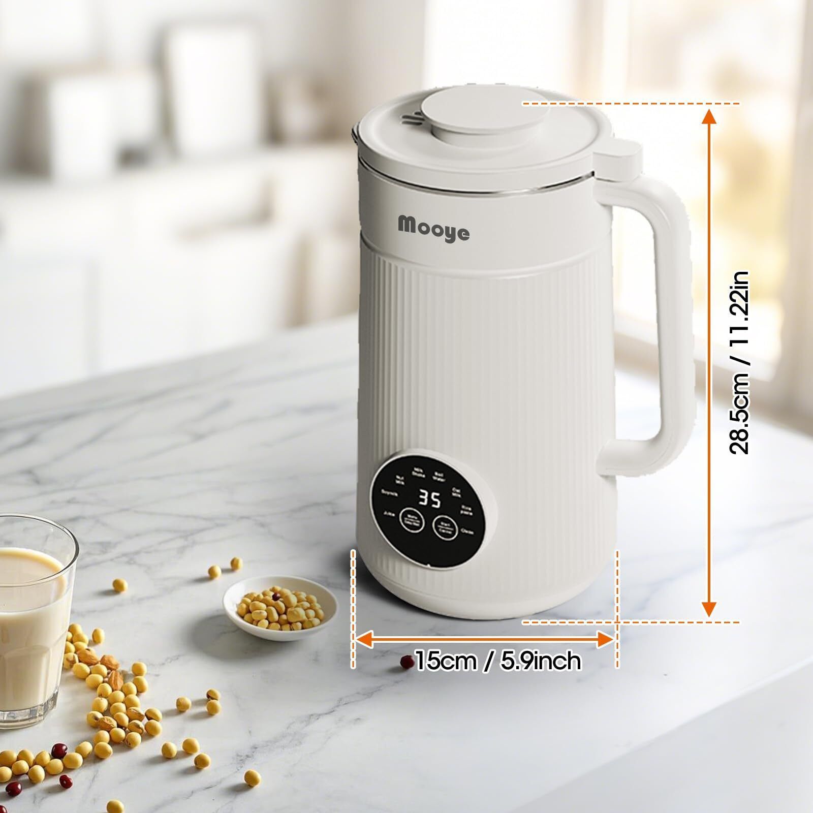 35oz Large-Capacity: 35oz(1L) large capacity Mooye nut milk maker for making a variety of beverages in one batch. You can produce 35oz(1L) of fresh milk or beverage using nuts, soybeans, fruit, and vegetables in minutes, perfect for 3-4 people. Best Gift Choice - Suitable for specific consumer groups such as vegetarians, lactose tolerant, milk protein allergies, etc. Whether for personal use or as a gift, this nut milk maker is a practical and stylish choice. We offer a 1-year warranty, If you have any questions, please feel free to contact us (user manual). Upgraded 10-blade 3D Design: The soy milk maker machine is equipped with a 3-layer design with 10 durable stainless steel blades which can ensure a smooth taste in your beverage. Suggest using our filter bag to get a better flavor. One-touch Automatic Program - With the Mooye milk maker, you can skip the soaking step, and it has various functions to meet your needs. Simply choose 8 One-touch Automatic Programs can be choose-- juice; Soymilk; nut milk; Milk shake; Boil Water; Oat Milk; Rice paste; and Self-Clean. RECIPE BOOK ACCESSORIES INCLUDED: 1* almond milk maker, 1* cleaning brush, 1* Cleaning Pad, 1* power cord, 1* measuring cup, 1*recipe book, 1* instruction manual are included. Learn how to make different types of nut milk with the Mooye milk recipe book! Automatic heat preservation function - some programs support 2 hours of automatic heat preservation, farewell to cold drinks and heating troubles. If you have any questions, please contact us.