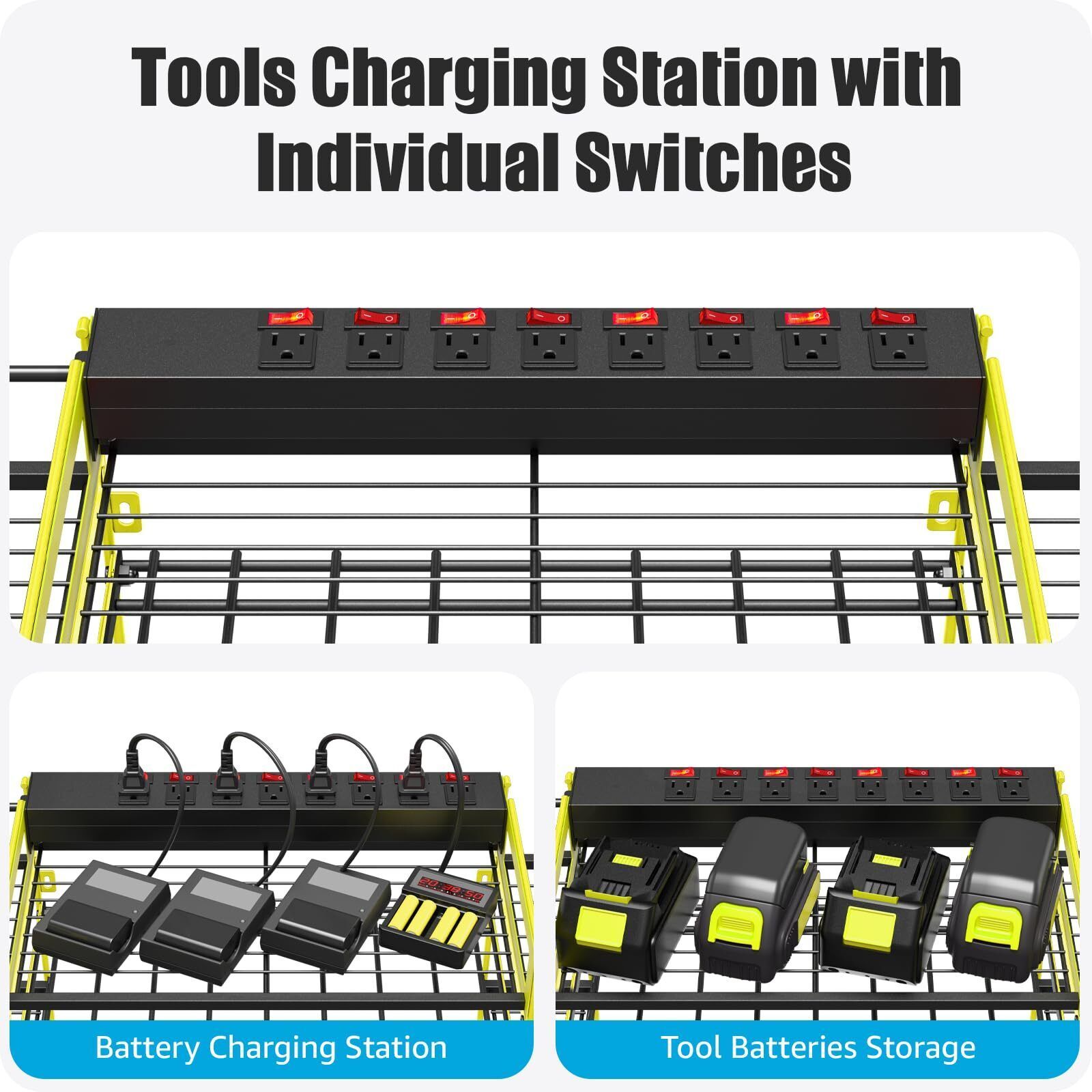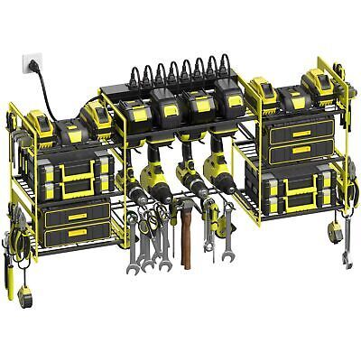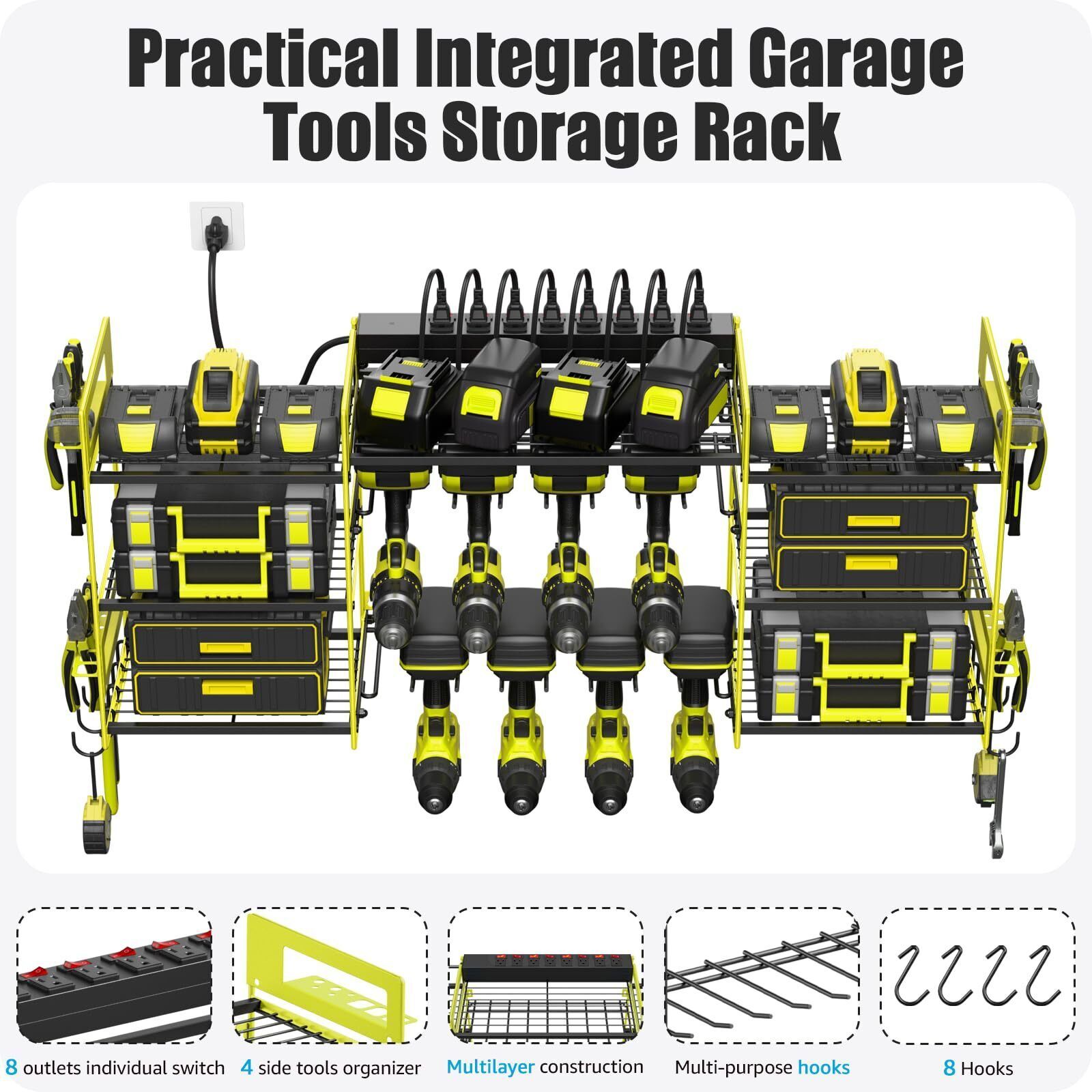 Green wall mount power tools organizer with individual switches 8 outlets power strip, lager size, 8 slots, 8 hooks, and 4 side tool organizer, 3 layer 7 tools shelves, can keep rechargeable tools organized in the work area and save your bench space and easy to store your frequently used tools together. About large size 39 inch long garage organizer with charging station, provides large enough storage space for 8 drills and 7 shelves. Open slot for up to 8 cordless drills, can also hang tools with holes if you don't have that many drills. The tools in the picture are for demonstration purposes only and are not included. Very convenient for charging your tool batteries, tools rack built-in metal 8 outlets with separate switch, avoids the hassle of unplugging and unplugging repeatedly. with surge protection of 1200J, Able to protect your device to a certain extent. Utility rack size: L:38.8in * W:9.4in * H:16.5in. Can be mounted on wall. Add 4 small tools rack on the side to store multiple types of gadgets - Commonly used tweezers, screwdrivers. Come with 8 hooks, easily empty your desktop and toolbox! can store a good amount of things. Simple to assemble and strong. Please read the instructions before assembly. This is large tool organizer to provide more storage space, each layer of the grid can support a maximum weight of 33IB. All metal ensured its longevity and strong enough, valuable addition to the workshop. Amazing christmas or father's day gift for men.