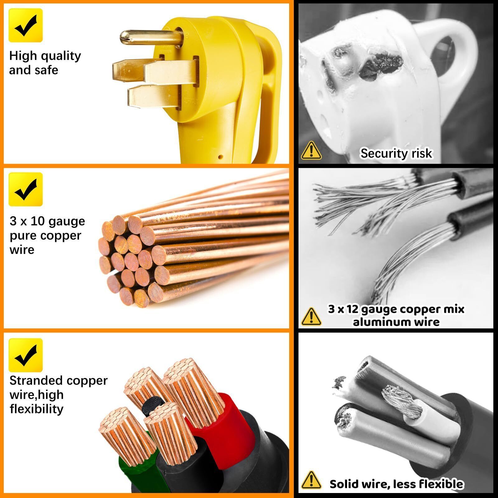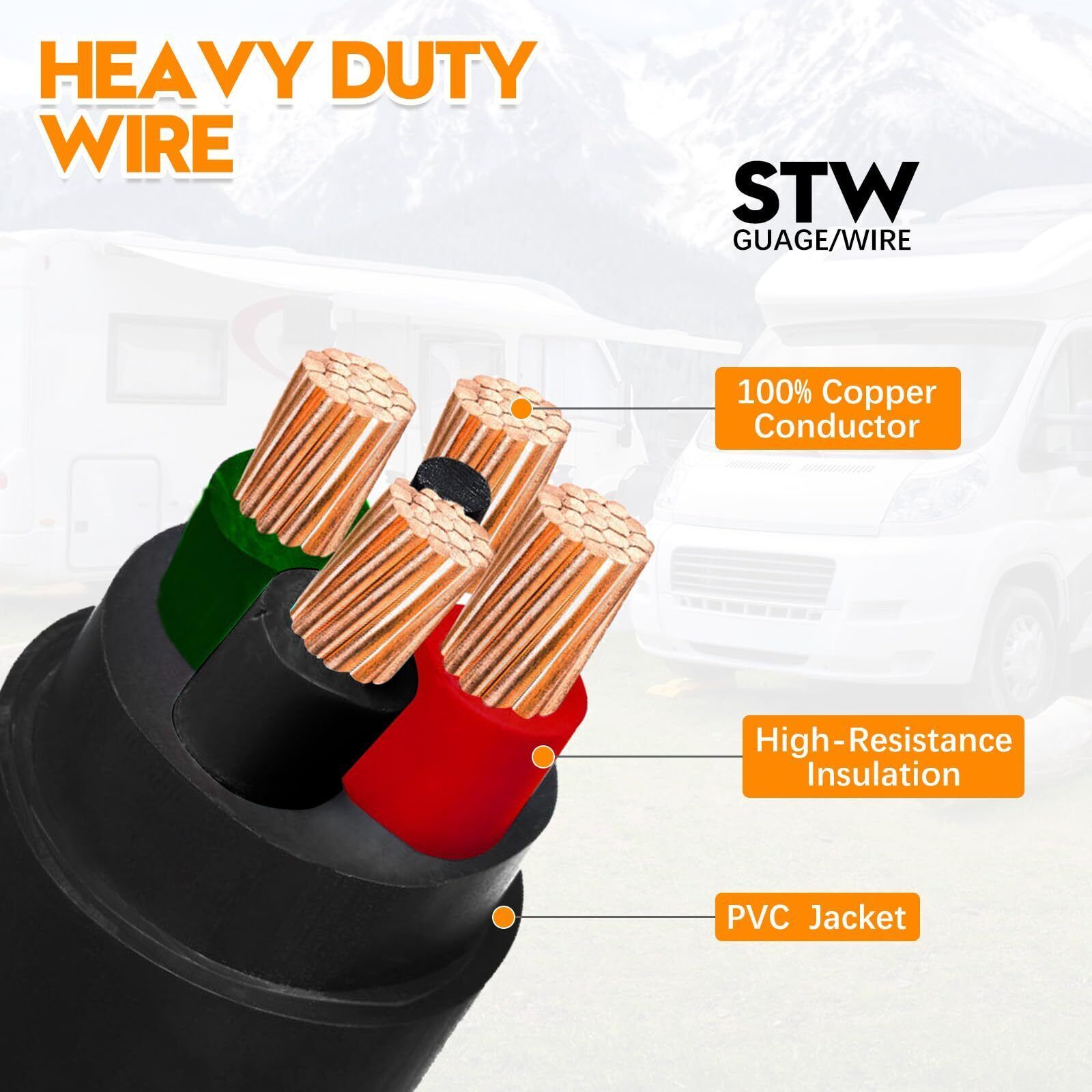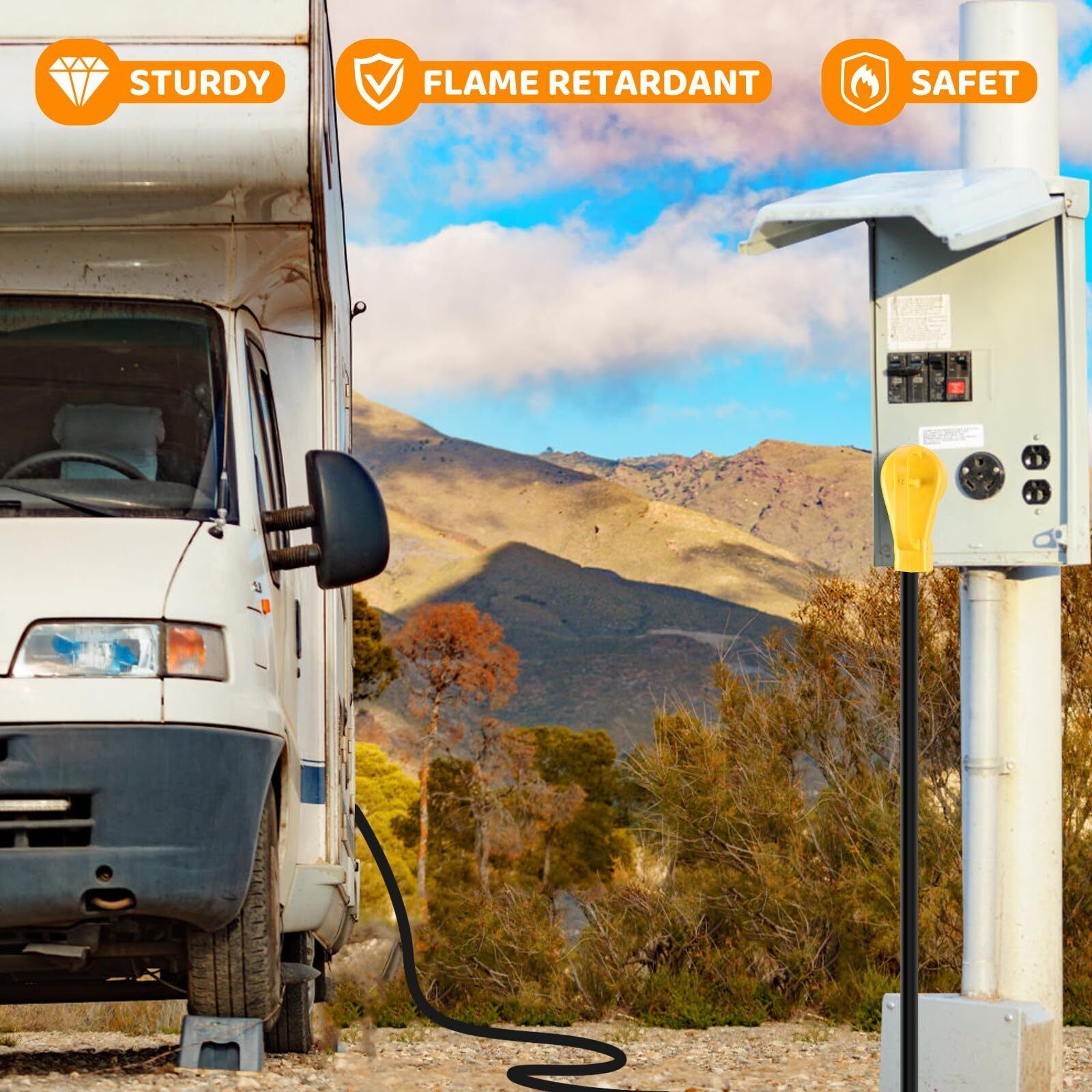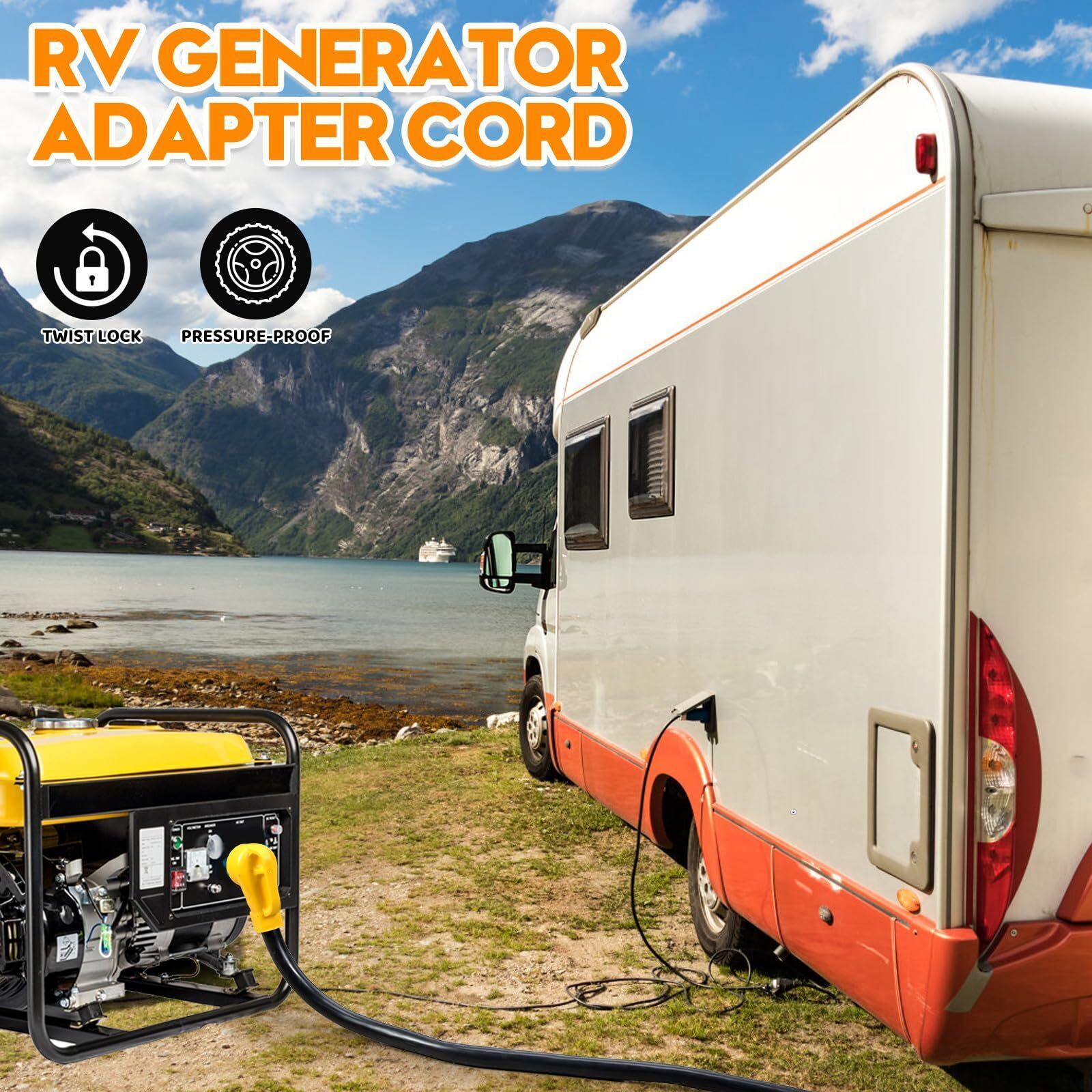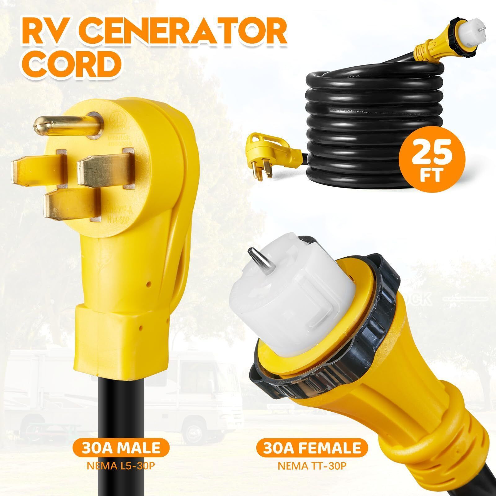 ?RV Generator Cord?50 amp generator cord connect 50amp portable generator to house's 50A SS2-50P or CS6375 power inlet box, manual transfer switch, breaker panel; 50 amp generator extension cord provide reliable connectivity to your generator, ensuring a steady power supply when you need it most ?SPECIFICATIONS?Length-25 FT; Voltage-125V/250V; PLUG-50AMP NEMA 14-50P Male to NEMA SS2-50R Female; Twist Locking Connector; Maximum Wattage-12,500 Watts with locking threaded ring ?Enhanced Safety Durable?50 Amp RV Power Cord Heavy Duty 50Amp Gauge The inner core is made of pure copper with a heavy-duty, flame retardant, UV-resistant polyethylene plastic jacket that remains pliable, smooth and durable even in extreme temperatures for up to 5 years ?Weatherproof Twist Locking Design?50 amp RV extension cord female twist locking connector with a threaded ring; This design ensures a secure and weatherproof connection between the adapter and your power inlet box; You can have peace of mind knowing that your power supply will stay intact even in challenging outdoor conditions ?ERGONOMIC DESIGN?The twist-lock ring on the female plug of the 50 amp generator cord helps keep dirt and rain out of the plug connection, while the ergonomic finger grip on the male plug makes it easier for you to plug and unplug ;RV extension cord 50 amp includes adjustable cord storage straps, making carrying and storing the cord a breeze