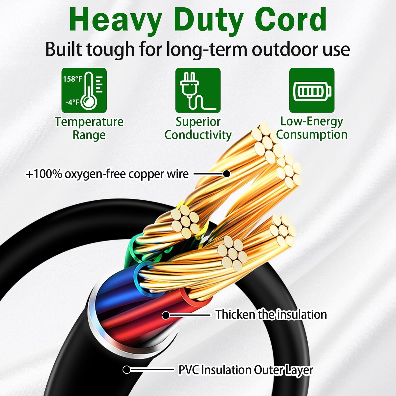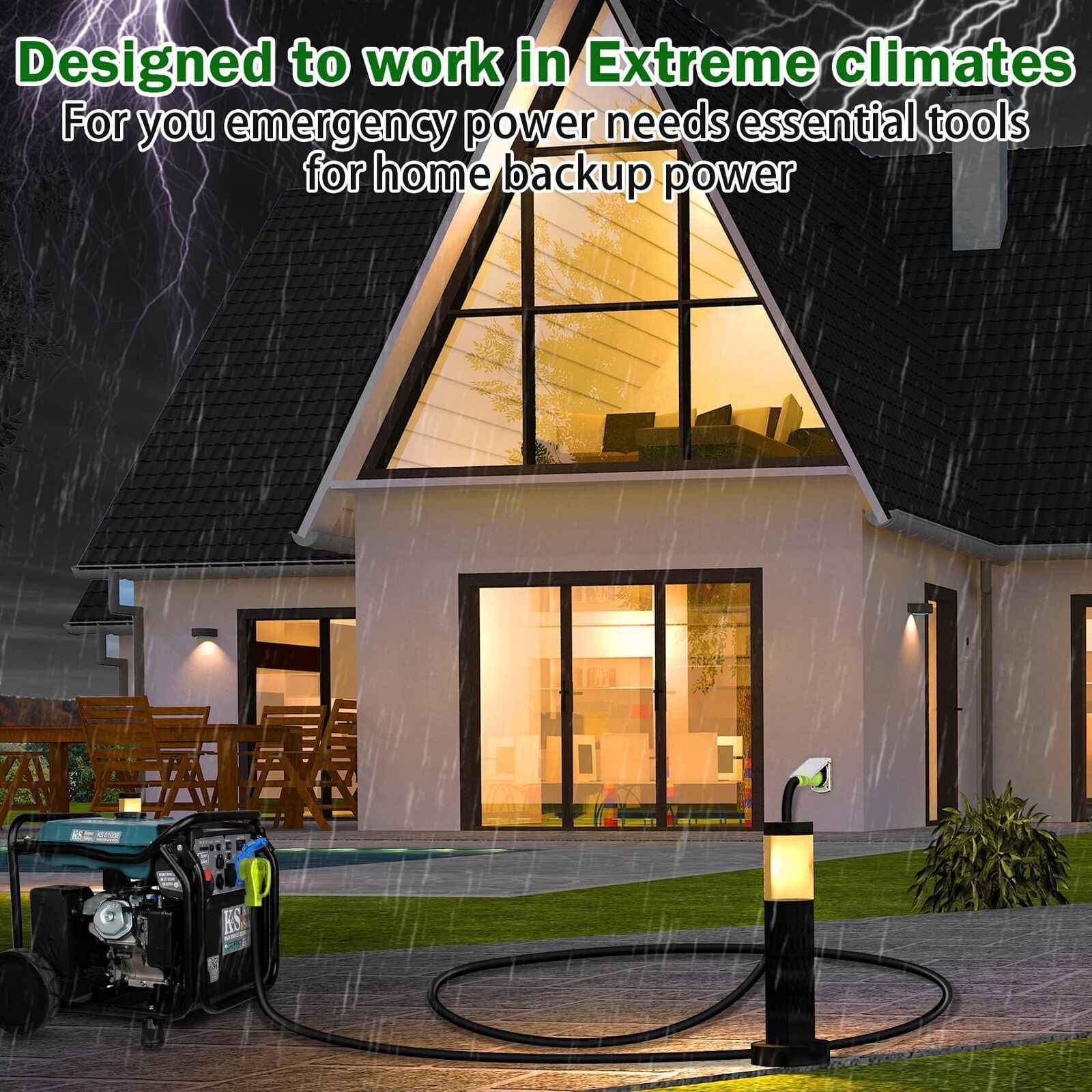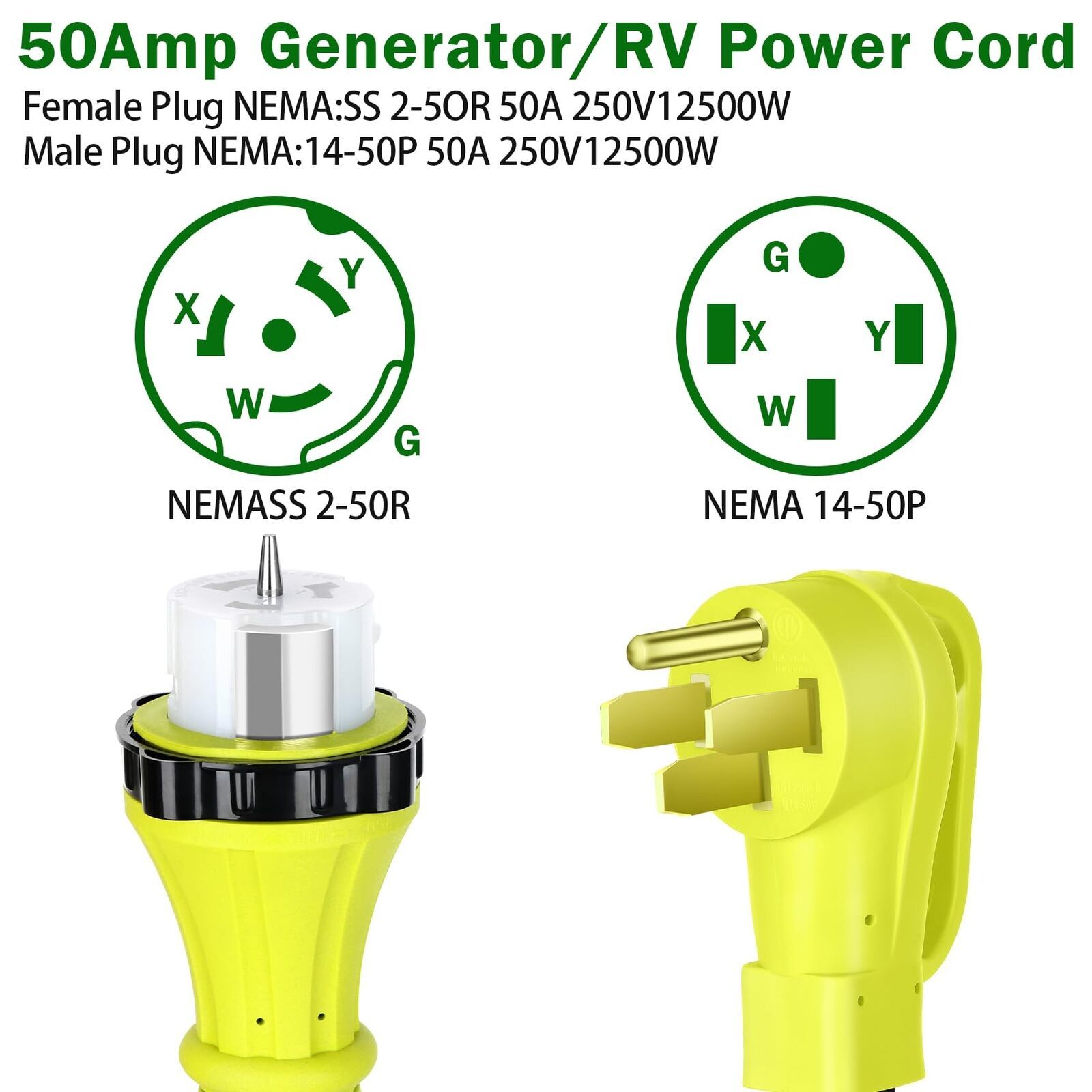 Emergency Power Ready: 50 amp generator cord connect 50amp portable generator to house's 50A SS2-50P or CS6375 power inlet box, manual transfer switch, breaker panel; 50 amp generator extension cord providing your family with a safe and reliable power supply during blackouts, storms, hurricanes, floods, or thunderstorms Reliable Electrical Rating: Male plug is NEMA 14-50P, 50A, 250V, 12500W; Female receptacle plug is NEMA SS 2-50R, 50A, 250V, 12500W with locking threaded ring; 50A generator outdoor extension cord waterproof constructed with heavy duty STW 6/3 + 8/1 AWG generator power cord; 50 amp rv cord all ETL certified Weatherproof Twist Locking Design: 50 amp RV extension cord female twist locking connector with a threaded ring; This design ensures a secure and weatherproof connection between the adapter and your power inlet box; You can have peace of mind knowing that your power supply will stay intact even in challenging outdoor conditions Enhanced Safety Durable: 50 amp rv power cord heavy duty 6/3 + 8/1 Gauge cord inner core made of pure copper and outer jacket is heavy duty flame retardant, UV-resistant polyvinyl plastic sleeve that serves as protection from outdoor weatherproof, wear and tear, ensuring optimal conductivity and reducing the risk of overheating or electrical hazards Easy to Use and Organize: 25 FT green 50amp generator extension cord comes with ergonomic grip handles on the male end for easy plugging and unplugging; RV extension cord 50 amp includes adjustable cord storage straps, making carrying and storing the cord a breeze