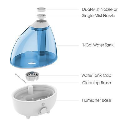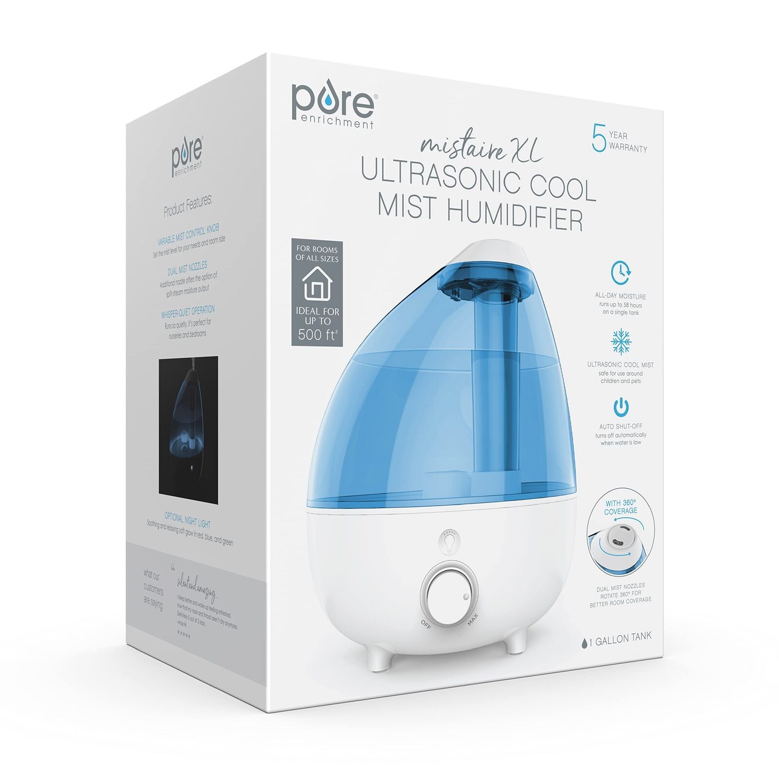 Long-Lasting Dry Air Relief: Ultrasonic cool mist technology safely moisturizes the air for 10 to 24 hours of continuous operation (depending on mist control setting) so you can breathe easily and get more restful sleep 1 Gallon Water Tank: Large tank and powerful steam output provides ideal coverage for large bedrooms, offices, living rooms, nurseries, and more, up to 500 square feet Year-Round Comfort: Variable mist settings combined with a 360 mist nozzle help you consistently balance and regulate the humidity in your home all year long for relief from cold-like symptoms and sinus issues Night Light Auto Shut-Off: An optional night light offers a soothing glow with 3 color options (red, blue, and green), while the automatic shut-off feature turns the humidifier off when water level is low or the water tank is removed What you Get: Humidifier, disk cleaning brush, two mist nozzles, user manual, and Pure Enrichment?s guaranteed 5-Year Manufacturer's Warranty. Our customer support team provides daily quality service and peace of mind to millions worldwide all from a brand you can trust