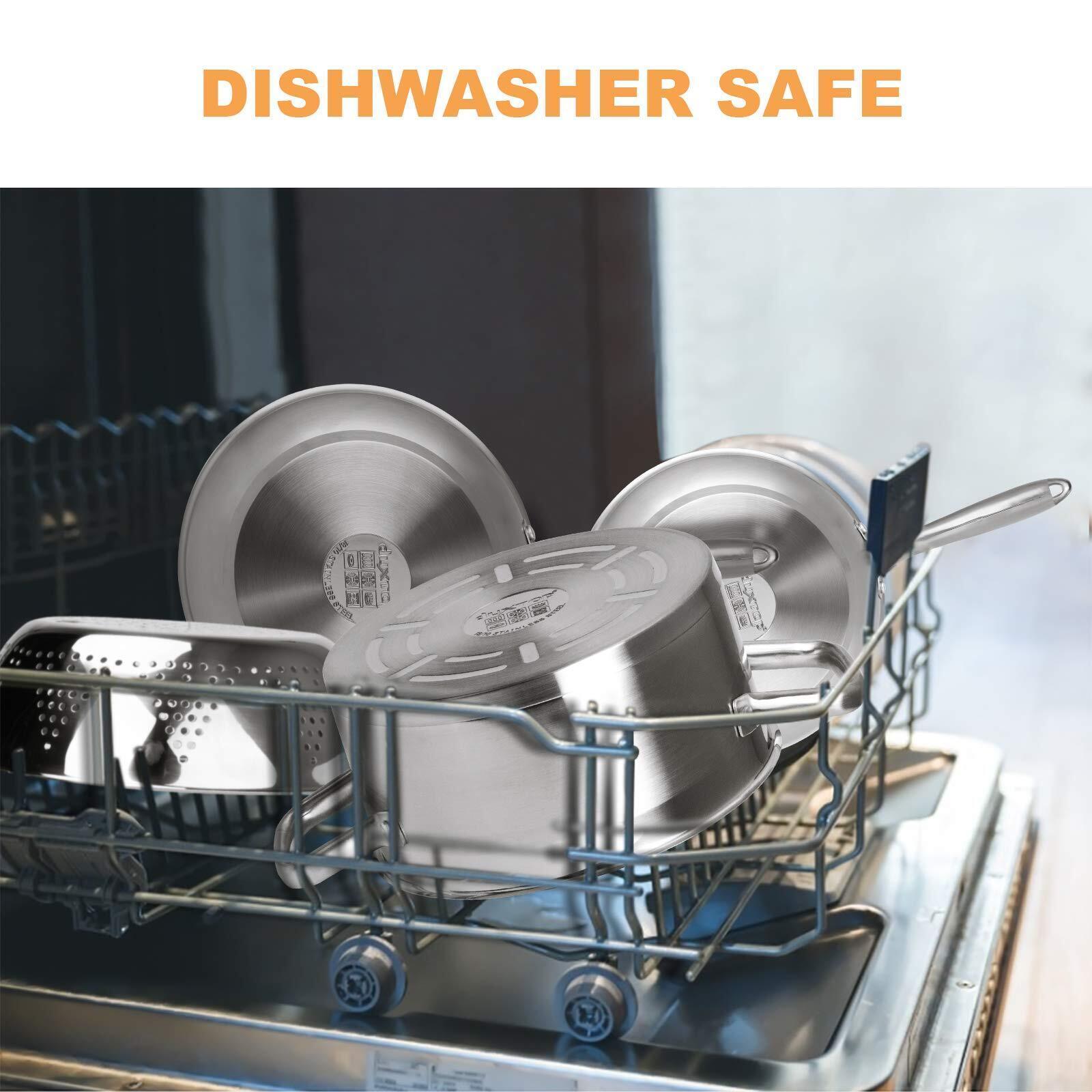 FOOD GRADE STAINLESS STEEL FAST HEATING:: Duxtop stainless steel cookware set is made of premium food grade 18/10 stainless steel. Heavy gauge impacted-bonded aluminum encapsulated bottom gives a quick, even and energy-efficient heating STURDY COMFORTABLE HANDLE: The cooking set features a classic straight-sided and drip-free pouring design. The stainless steel rivets secure the stylish shaped handle firmly to the pan?safe and durable. Clear measure marks inside is for easy measuring VERSATILE: 3.1-quart saucepan with pour spout and double-sided strainer lid ensures drip-free pouring and superior draining control. Large 8.6-quart stockpot covered with pasta insert and steamer insert is great for boiling and steaming 18PC COOKWARE: 1.6 QT saucepan, 3.1 QT saucepan, 4.2 QT casserole, 8.6 QT stockpot, 5.5 QT saute pan, which all come with lids.8 in fry pan, 9.5 in fry pan, 9.5 in boiler basket, 9.5 in steam basket, 8 in glass lid, 6.6 in trivet, spoon and slotted spatula MULTIFUNTATION 100% GUARANTEE: Duxtop kitchen pots and pans set is suitable for induction, gas, electric and halogen cooktops. Oven-safe to 550F (glass lid is oven-safe to 400F). Dishwasher-safe