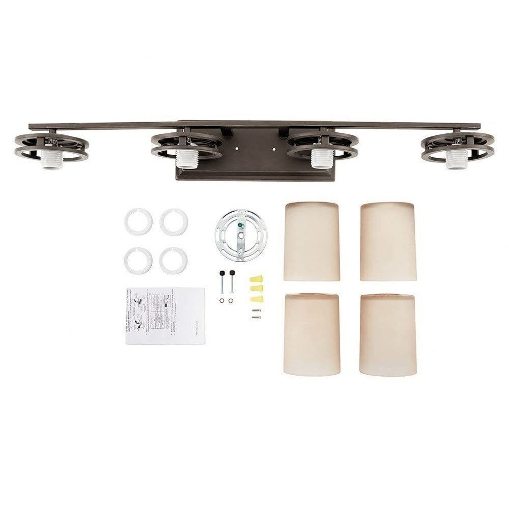 Offers a classic design that works well with traditional and modern decor. The 4 light Hendrik vanity light is perfect above a large vanity mirror in a bathroom or powder room. The light umber etched glass provides a beautiful, ambient lighting to the entire room.Think of it as a foundation or a canvas upon which to paint a distinctive lighting picture. It?s a beautiful light source in your living space. What's in the Box: (1) Mounting Strap, Strap Mounting Screws, Mounting Screws, Lock up Knobs, Lockwasher, (4) Glass Shade(s) and Wire Nuts. Bulb(s) not included. Cleaning instructions: Be certain the electric current is turned off before cleaning. Clean metal components with a soft cloth moistened with a mild liquid soap solution. Wipe clean and buff with a very soft dry cloth. Takes 4 medium E26 100W bulb equivalent