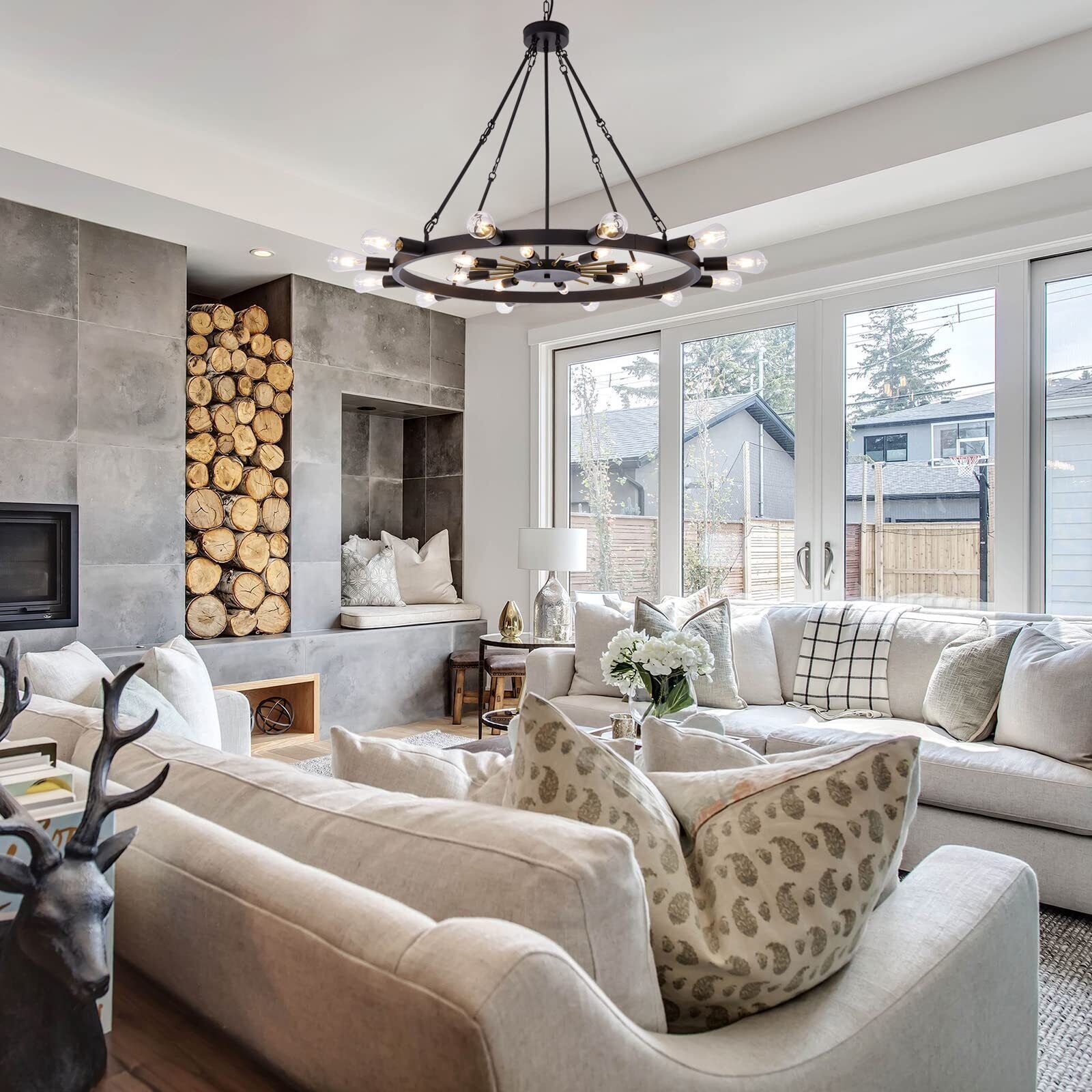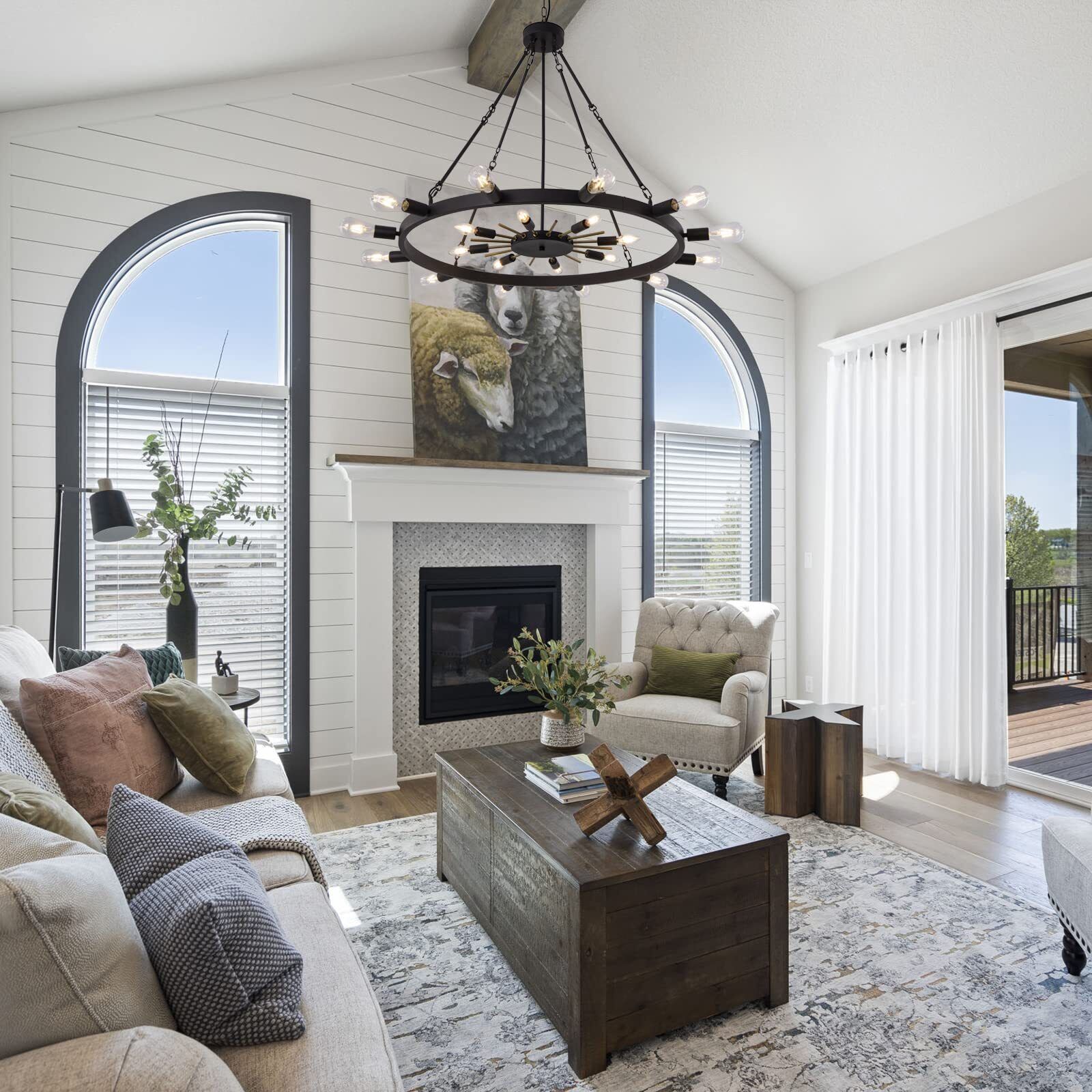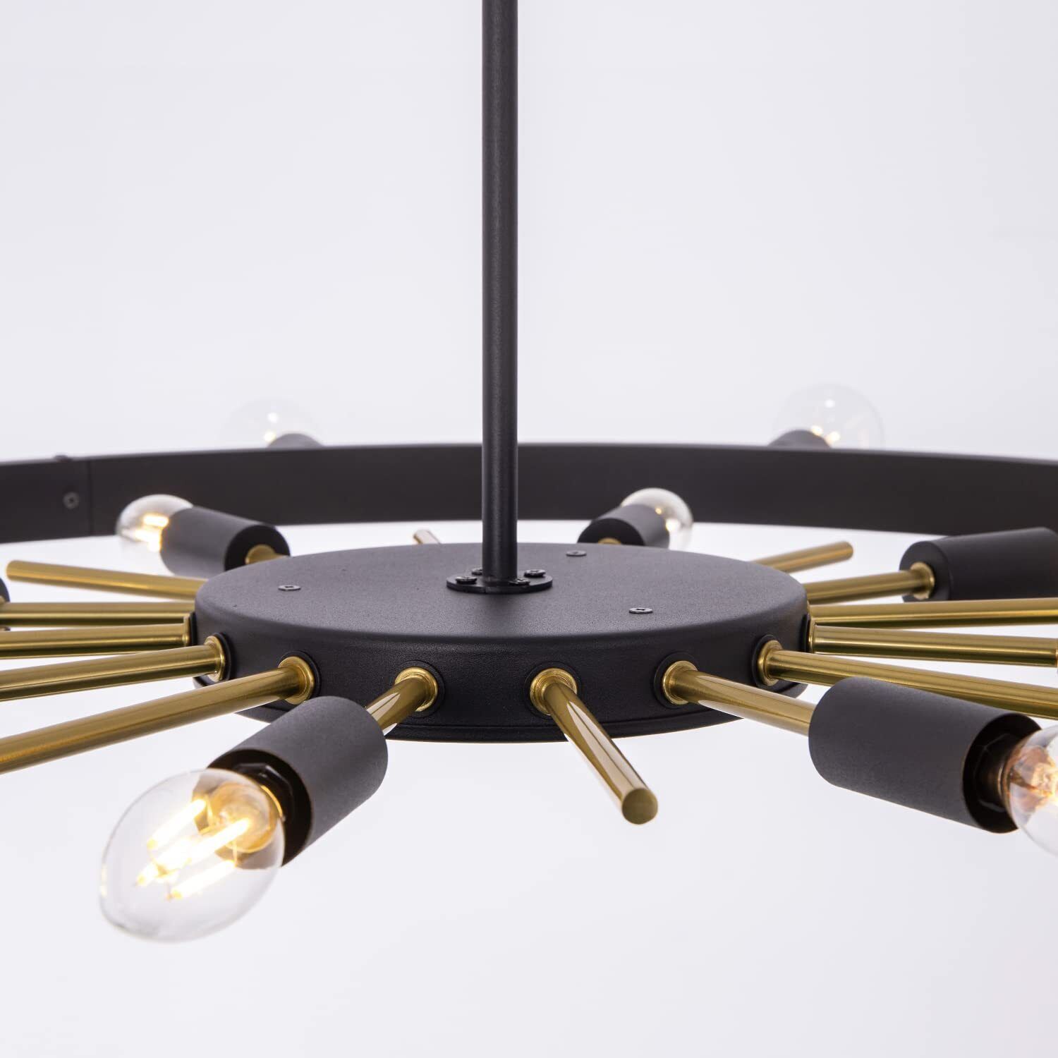 ?Unique design?: We have used two layers of lighting inside and out to create the shape of the chandelier, the overall shape is based on the sun, the interior is accented with golden metal bars and the 20 light source is designed to provide sufficient lighting. ?Just the right size?: 42''L * 42''W * 35''H, with adjustable chain, the maxium height to the ceiling would be 74''. Suit with large spaces need and high ceiling. ?Bulb Requirement?:This chandelier needs two types of bulbs which are 8*E12 and 12*E26, installed on the inner and outer layers respectively. Supporting multiple types, incandescent, halogen, LED. ?Perfect Angle?:Symmetrical design, no matter from which angle to view the chandelier can attract your eyes. ?Easy to install?:The chandelier is packaged in sets of assemblies, the assembly is not complicated, and our light cups are magnetically mounted, very easy to install, just follow the instructions for the steps. ?No worries for purchase?: Our products support 30-day no-excuse return, and our team is always available to help you with your products, if you have any questions or after-sales issues, please feel free to ask us for help!