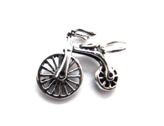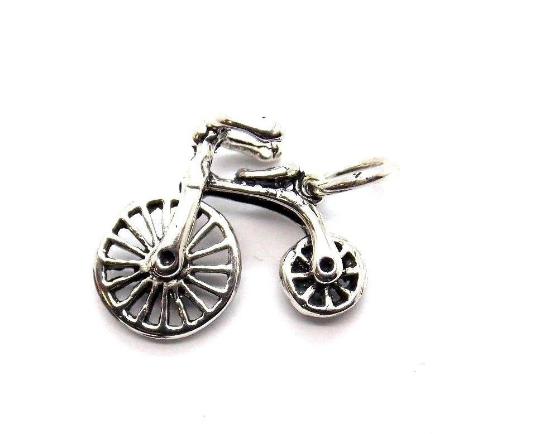 .925 STERLING SILVER BICYCLE PENDANT. THE CHARM IS 100% HANDMADE AND IS MANUFACTURED BY US BOTH OF THE WHEELS SPIN. WE HAVE BEEN IN TE JEWELRY BUSINESS FOR MORE THAN 30 YEARS. PLEASE JUDGE BY THE PICTURES; IF ANY QUESTIONS FEEL FREE TO ASK.