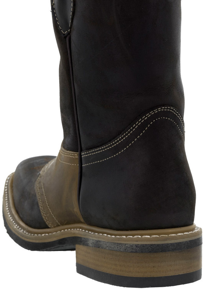 These boots feature genuine leather shafts uppers (vamps), welt stitched full leather soles that are reinforced with wood pegs and solid brass nails for durability. Stacked leather heels, full leather linings, and a rubber heel cap for a sturdier step.