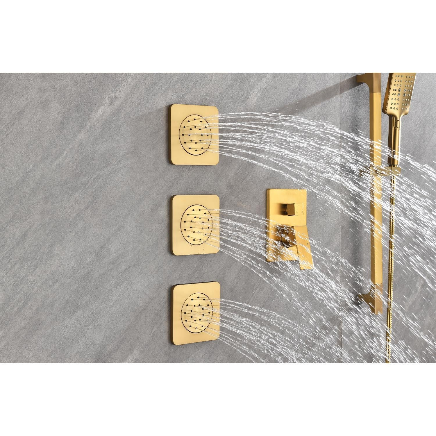 Installation method: wall-mounted.Includes: shower head, hand shower head, slider, body spray, 59-inch shower hose, water control valve, mounting hardware included.