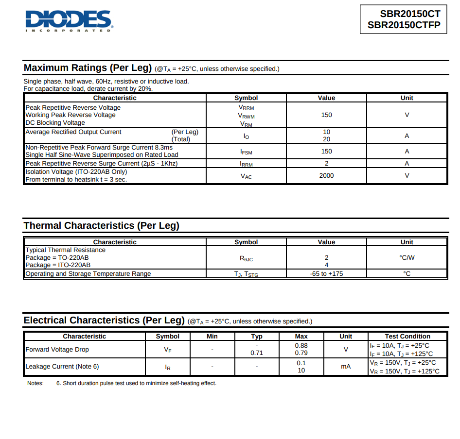 Pack of 10PCS - SBR20150CTFP Diodes Inc Schottky Rectifier 150V 20A Diode ITO-220AB Dual Anode Common Cathode