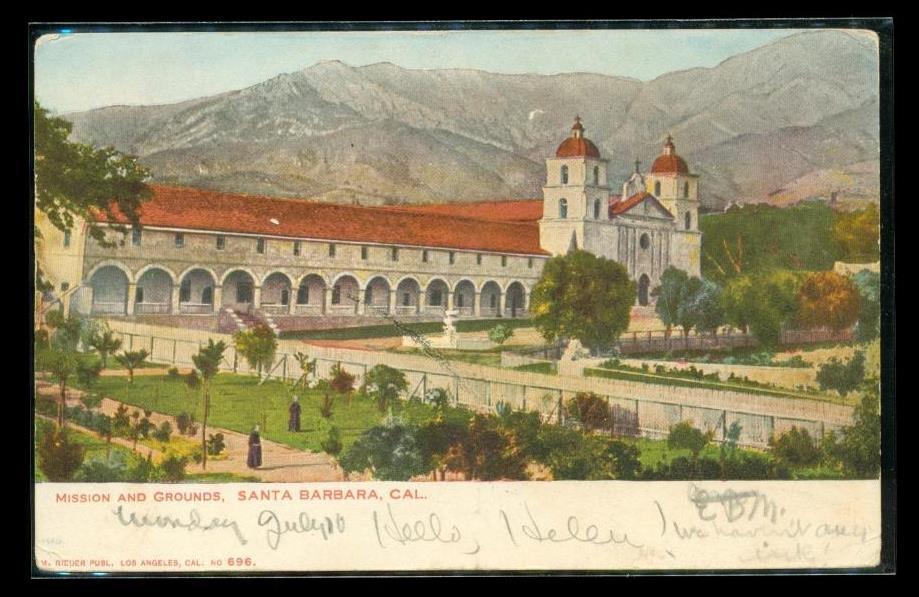 Vintage Souvenir Postcard Mission Grounds Santa Barbara California 1905 Cancel