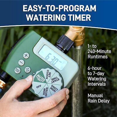 Introducing the Orbit Large Area All-In-One Automatic Sprinkler System Kit, a revolutionary solution for effortless yard irrigation. Create a zone automatic sprinkler system using just a hose faucet water source, without the hassle of connecting to an in-ground water supply. This technologically-advanced system is designed to make your life easier and your yard greener. Key to the system's efficiency is the patented Blu-Lock tubing system, featuring a revolutionary stainless steel retaining ring. This innovative design allows for quick and easy installation, with fittings that slide on 80% faster and are 25% stronger than traditional barb fittings. Say goodbye to leaks and weak connections ? enjoy a stronger, more reliable system in less time. Forget about dry spots ruining your lush lawn. The 6 pop-up gear drive sprinkler heads provide head-to-head coverage and can be easily adjusted even with the water on or off. Achieve uniform watering and ensure your entire yard receives the hydration it needs. Take control of your irrigation schedule with the included digital timer. With oversized features for ease of use, this timer allows for programmable runtime and interval scheduling flexibility. The manual rain delay option helps conserve water during inclement weather. Its heavy-duty, weatherproof construction ensures durability and reliable performance year-round. Invest in the future of yard irrigation with the Orbit Large Area All-In-One Automatic Sprinkler System Kit. Efficient, comprehensive, and cutting-edge, it's time to upgrade your yard with an automatic watering system that delivers results. Don't settle for anything less than the best ? choose Orbit and experience the difference in your lawn. Your plants will thank you.