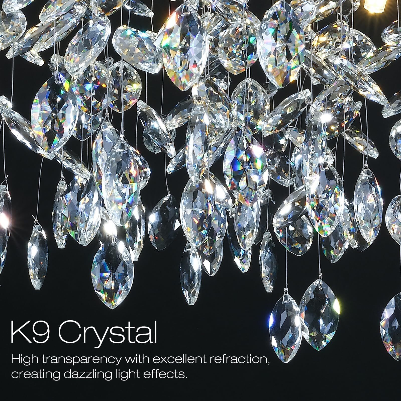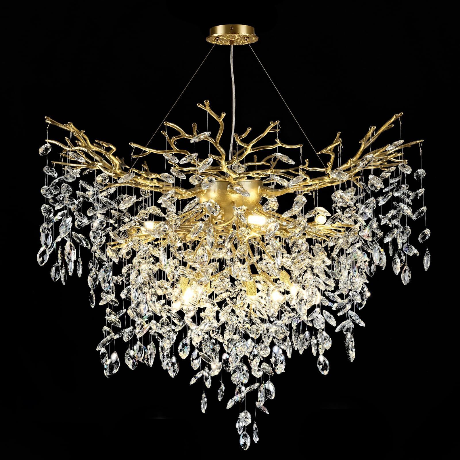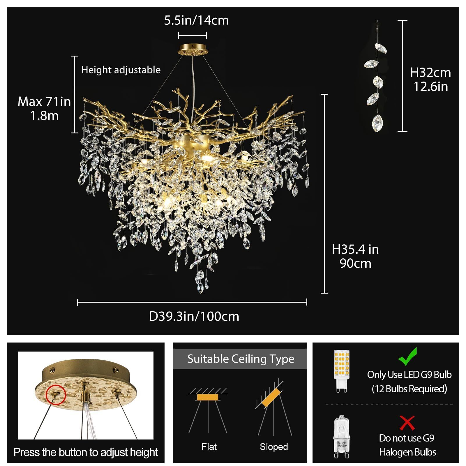 Modern Crystal Chandelier: This tree branch chandelier is like a flourishing branch, together with the special circular design and expensive K9 crystal material, makes the whole branch chandelier can add light and color to your home decoration Luxury Crystal Chandelier: This round chandelier over table is 40in/100cm in diameter, overall height is 35.4in/90cm, the length of the hanging wire can be adjusted up to 71in/180cm.The unique tree branch shape + round design adds a unique personality to your space Light Source Selection: This dining room chandeliers brass requires 12 x G9 bulbs (bulb supplement included inside), you can buy different color temperature bulbs according to your needs, the picture shows the effect of 3000K warm light. Apply hardwiring, support to adjust the brightness of the light (need to purchase additional dimmer switch) Applicable to a Variety of Spaces: This luxurious and sparkling crystal gold chandeliers for dining room can enhance the elegance and luxury of the space, which is very much used in a variety of spaces such as living room, dining room, over table, kitchen island, entrance hall, entry foyer, stairwell, cafe and so on 100% K9 Crystal Material: The brass modern chandelier's strings are made of 100% K9 crystal material, which has higher transparency and refraction effect, and shines under the light. Each bead is strung manually, the branches are made of aluminum alloy and molded in one piece, which is not easy to rust, and the exterior paint is not easy to peel off. Light weight but can provide enough support, each branch is detachable and easy to assemble