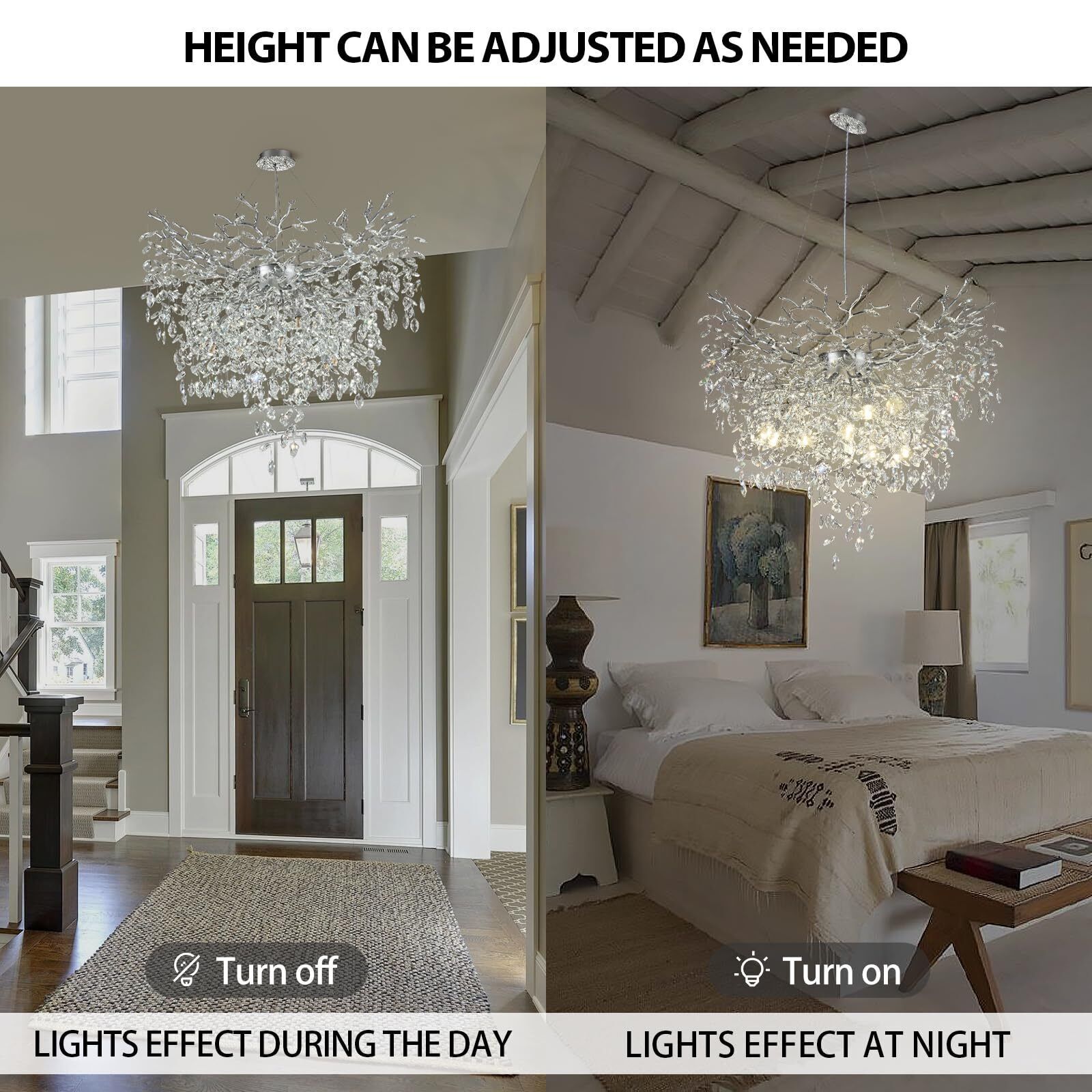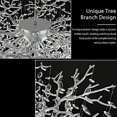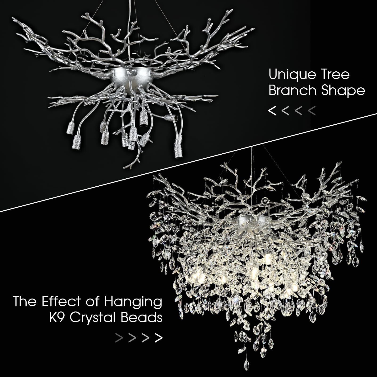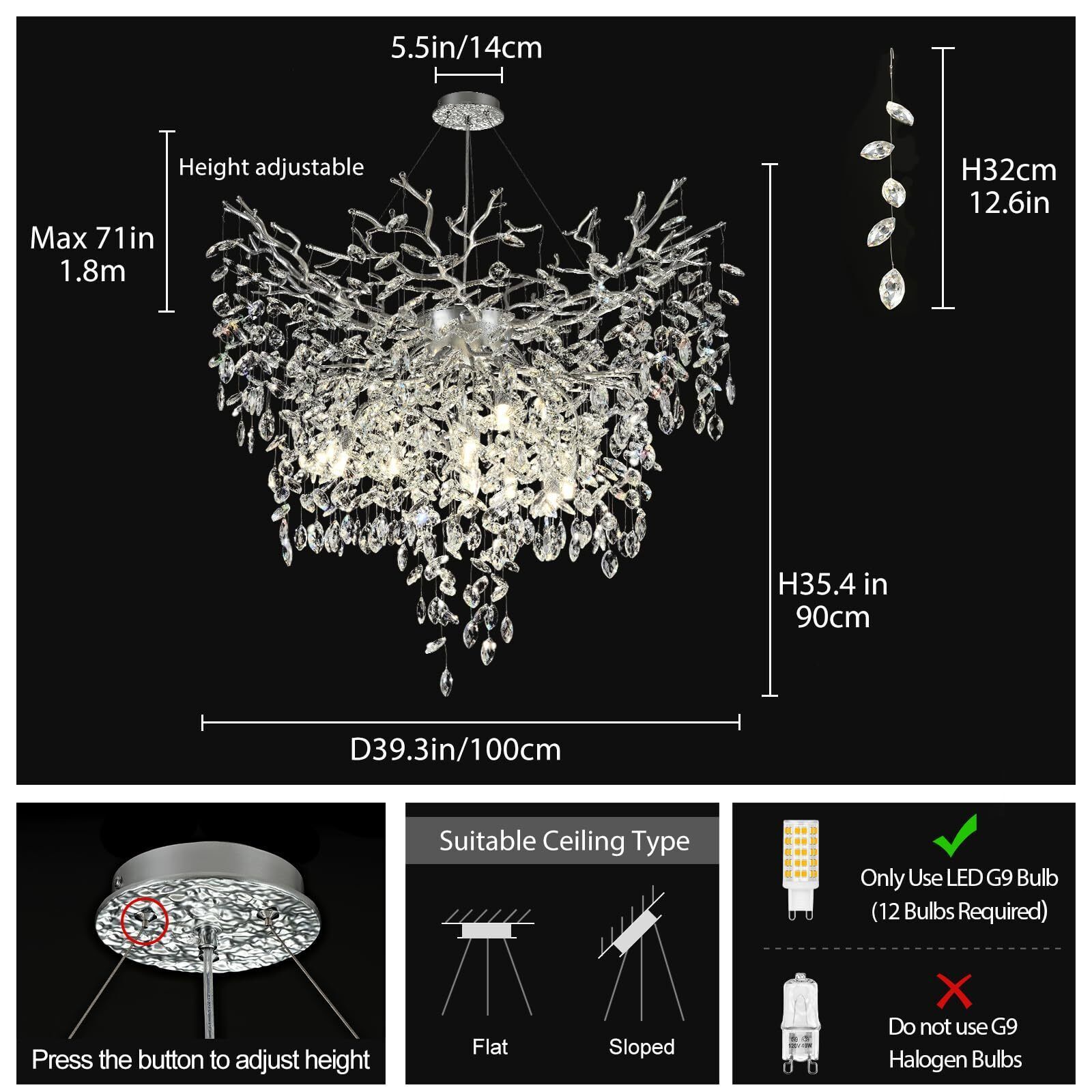 Modern Crystal Chandelier: This tree branch chandelier is like a flourishing branch, together with the special circular design and expensive K9 crystal material, makes the whole branch chandelier can add light and color to your home decoration Luxury Crystal Chandelier: This round chandelier over table is 40in/100cm in diameter, overall height is 35.4in/90cm, the length of the hanging wire can be adjusted up to 71in/180cm.The unique tree branch shape + round design adds a unique personality to your space Light Source Selection: This dining room chandeliers silver requires 12 x G9 bulbs (bulb supplement included inside), you can buy different color temperature bulbs according to your needs, the picture shows the effect of 3000K warm light. Apply hardwiring, support to adjust the brightness of the light (need to purchase additional dimmer switch) Applicable to a Variety of Spaces: This luxurious and sparkling crystal nickel chandeliers for dining room can enhance the elegance and luxury of the space, which is very much used in a variety of spaces such as living room, dining room, over table, kitchen island, entrance hall, entry foyer, stairwell, cafe and so on 100% K9 Crystal Material: The silver modern chandelier's strings are made of 100% K9 crystal material, which has higher transparency and refraction effect, and shines under the light. Each bead is strung manually, the branches are made of aluminum alloy and molded in one piece, which is not easy to rust, and the exterior paint is not easy to peel off. Light weight but can provide enough support, each branch is detachable and easy to assemble