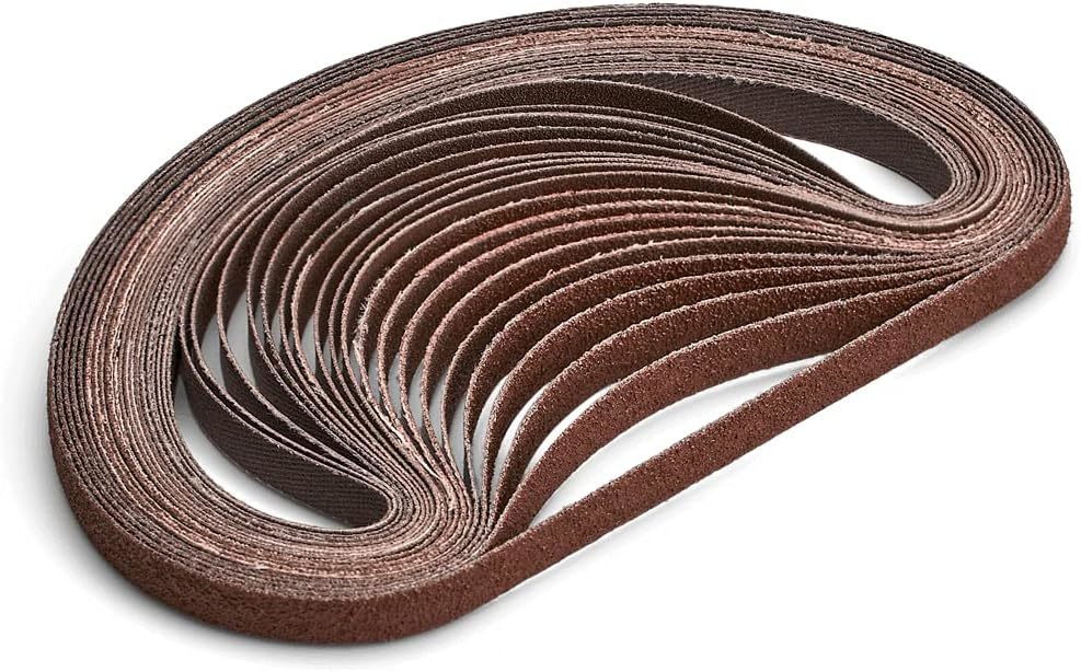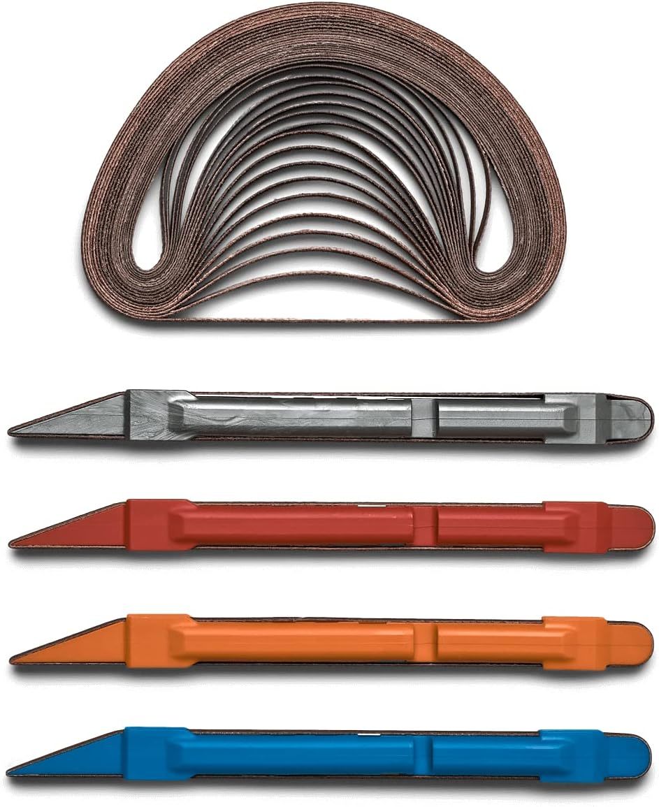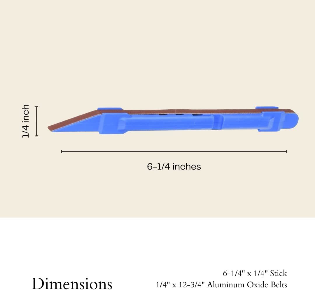 Hexagon shaped for comfort Hold 1/4" x 12-3/4" aluminum oxide belts The 6-1/4" x 1/4" sticks are made of impact resistant plastic 24 Piece Standard Kit includes 4 color coded sticks and 5 belts each in 80, 120, 180, and 240 grits Have a spring tensioned back to keep the sanding belts firmly in place or allow quick belt rotating