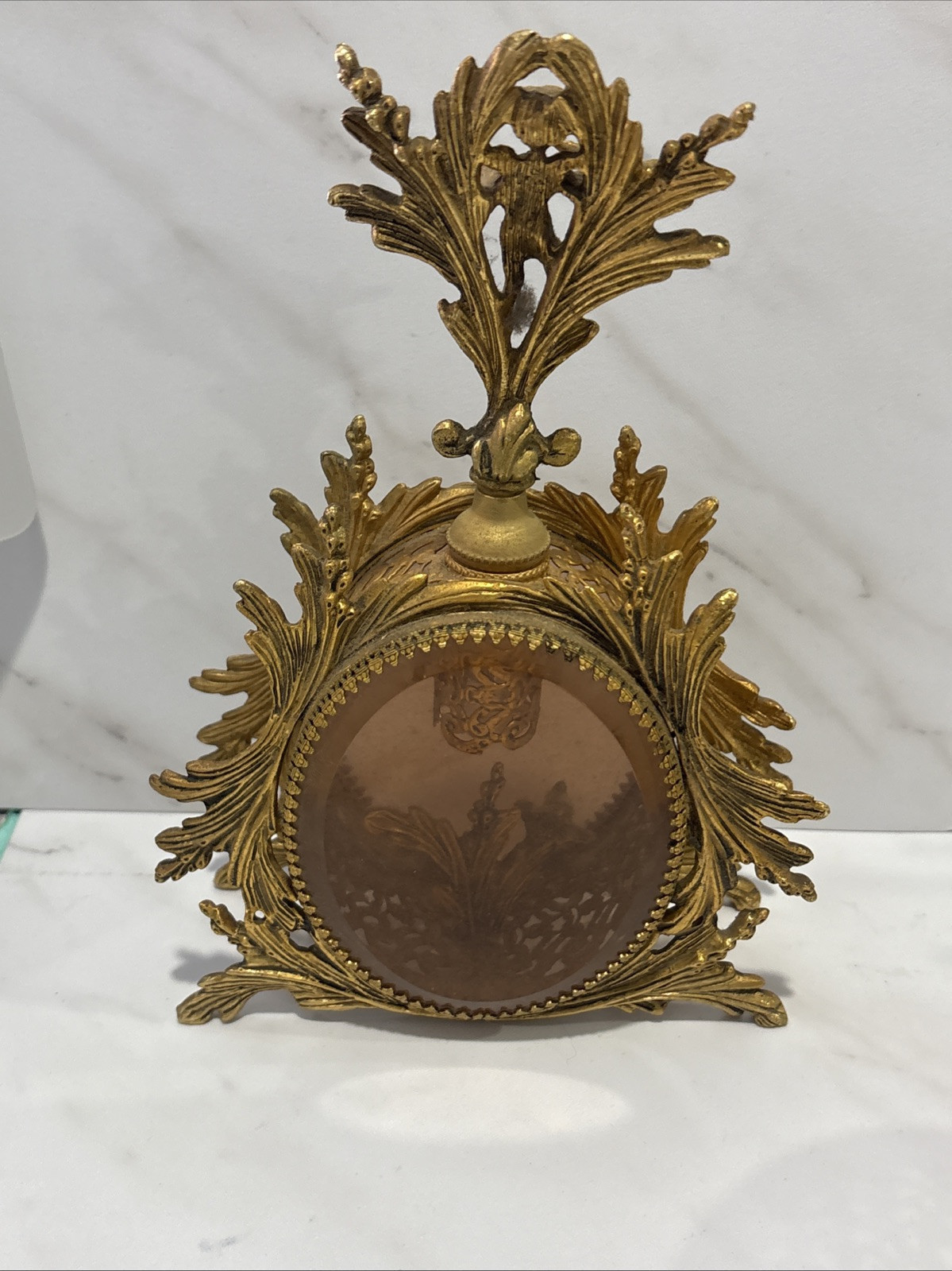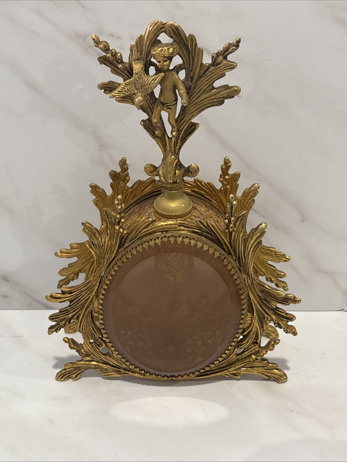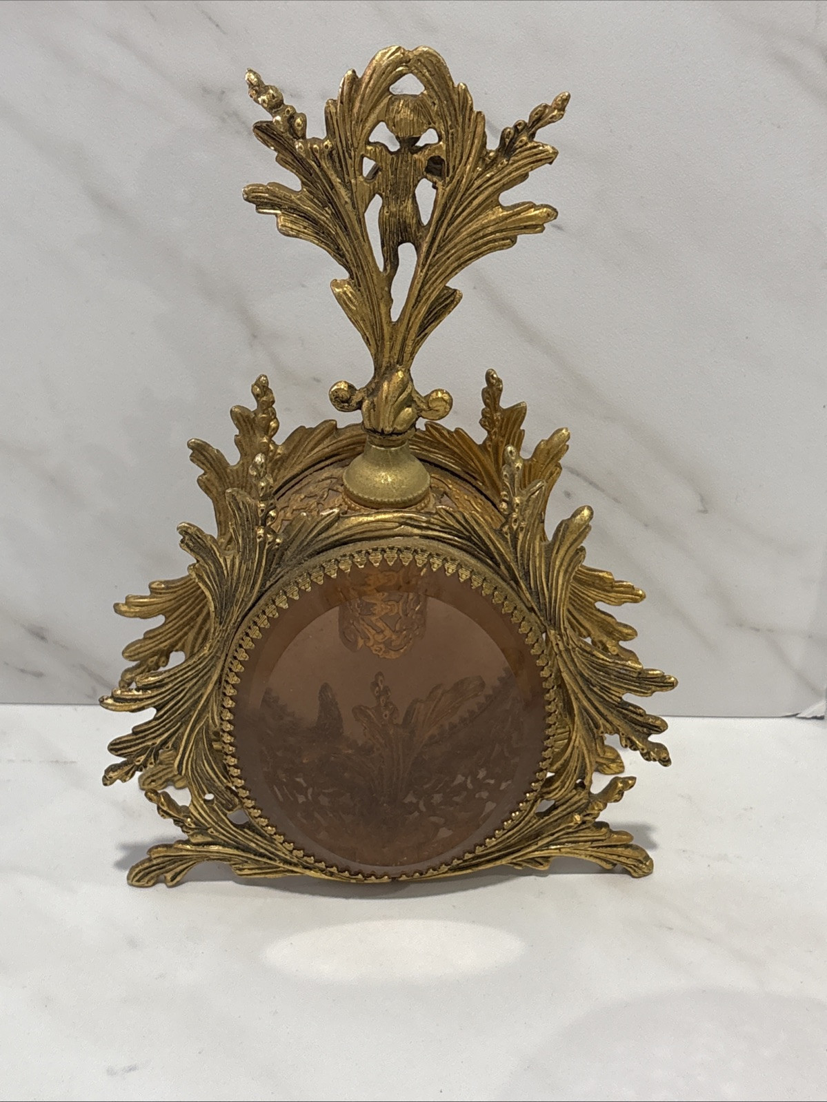 Antique Art Deco Ormolu Amber Glass Cherub (2) Perfume Bottle (1) Jewelry Box Decor