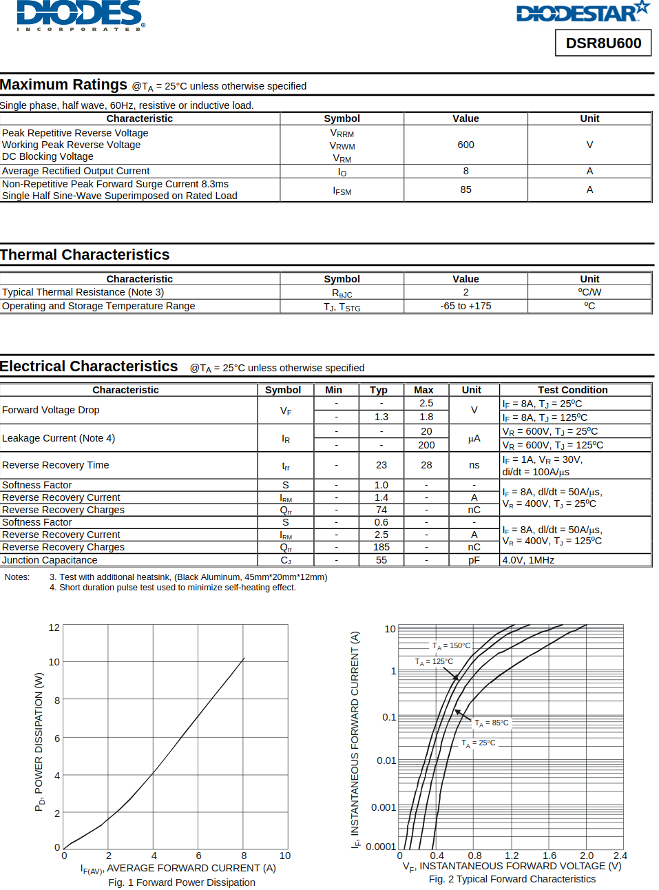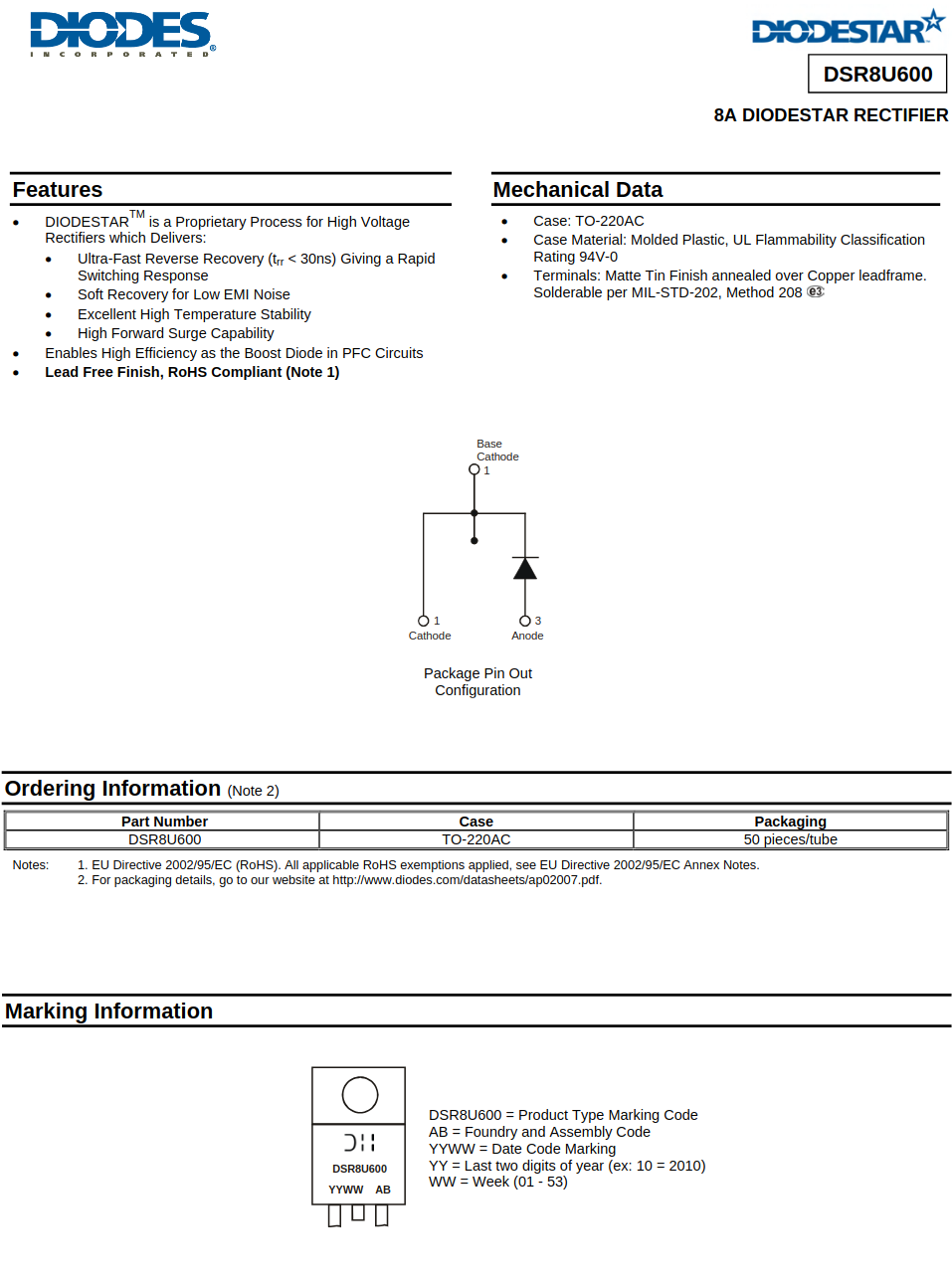 DSR8U600 Diodes Inc Ultrafast Switching Rectifier 600V 8A Diode TO-220