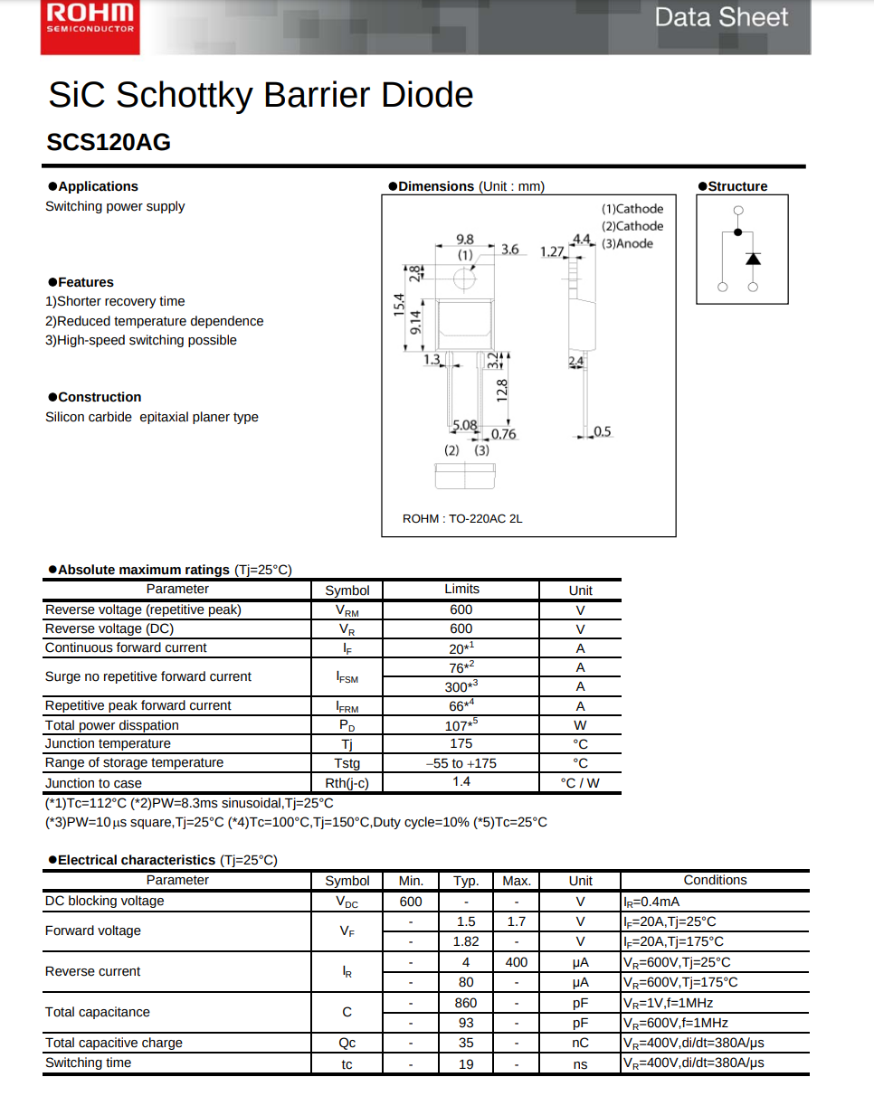 SCS120AG ROHM SiC Schottky Diode 600V 20A Rectifier 19ns TO-220