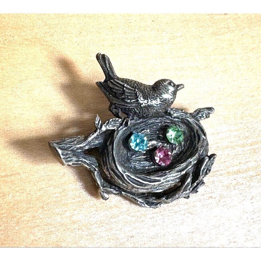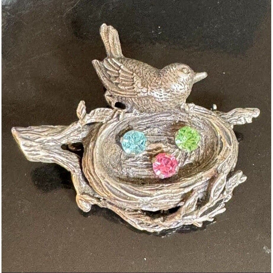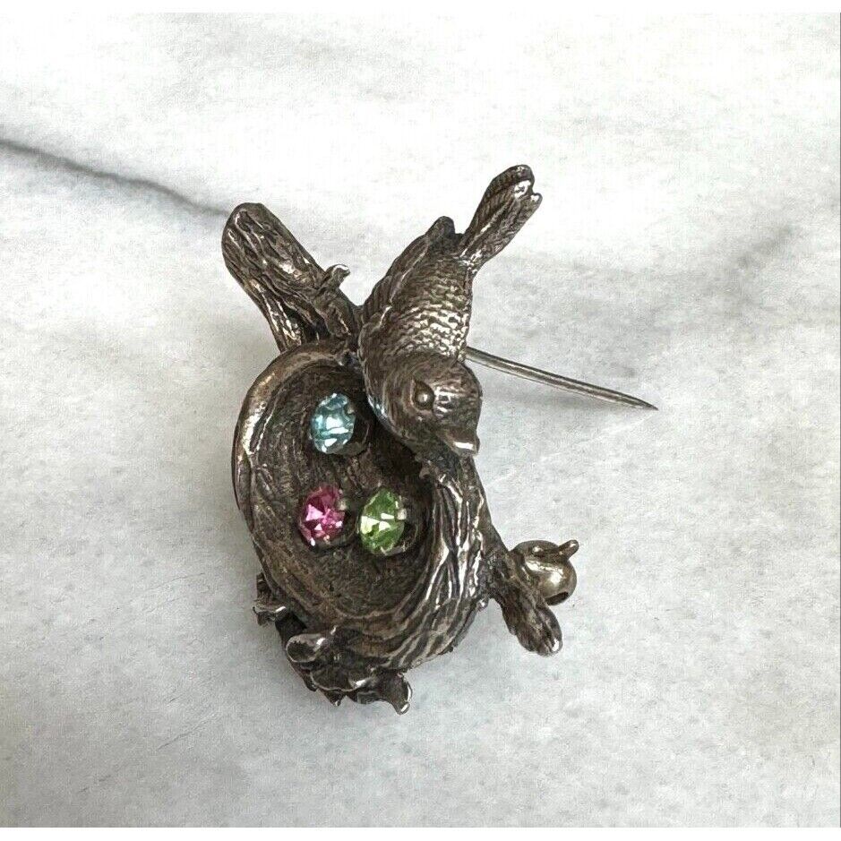 ANSON SOLID CAST 925 STERLING SILVER RHINESTONES BIRD'S NEST WITH EGGS BROOCH SKY
