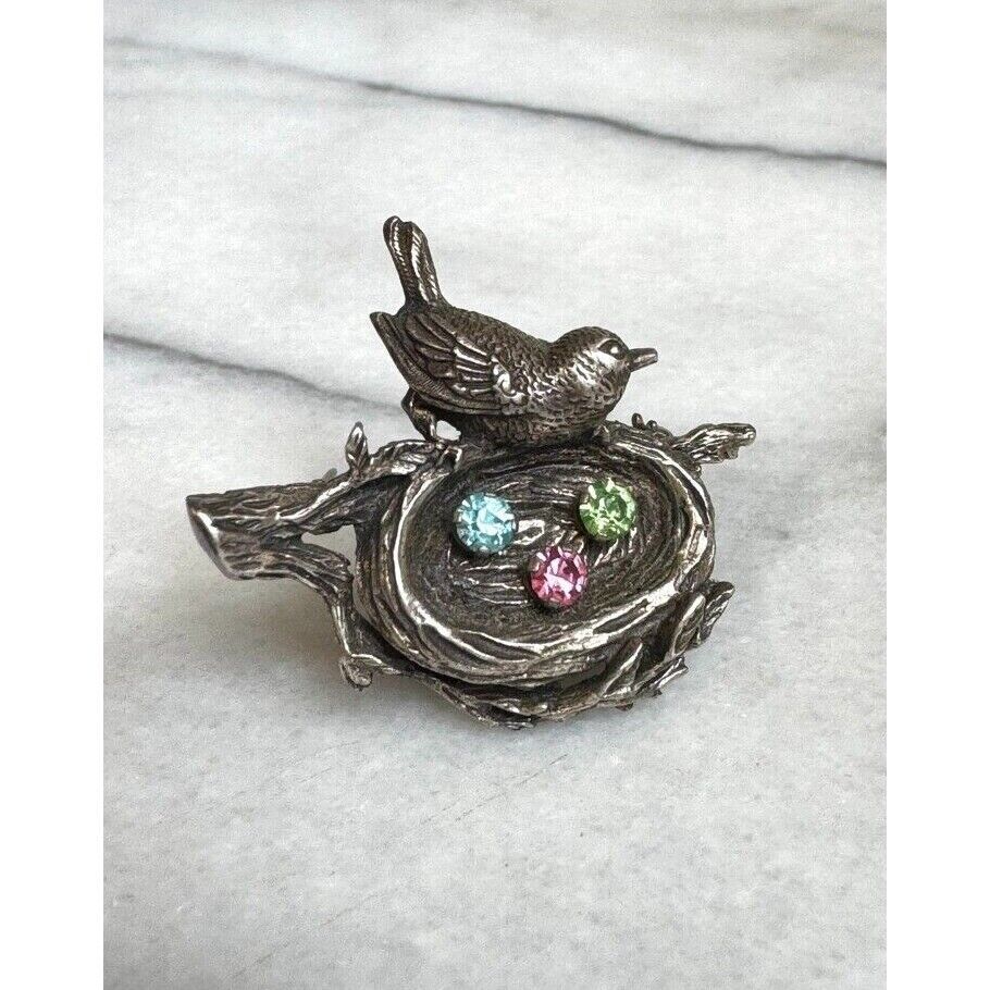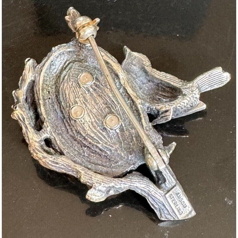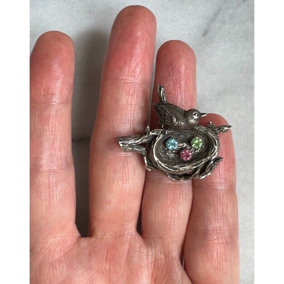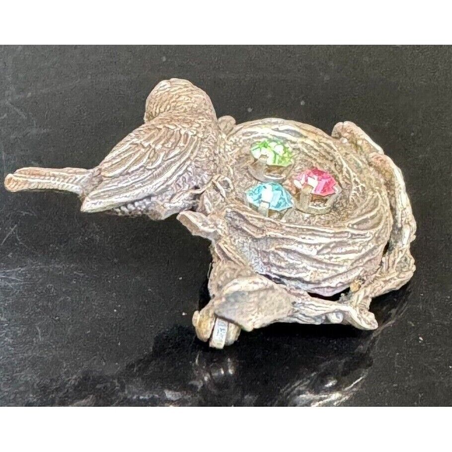 ANSON SOLID CAST 925 STERLING SILVER RHINESTONES BIRD'S NEST WITH EGGS SKY