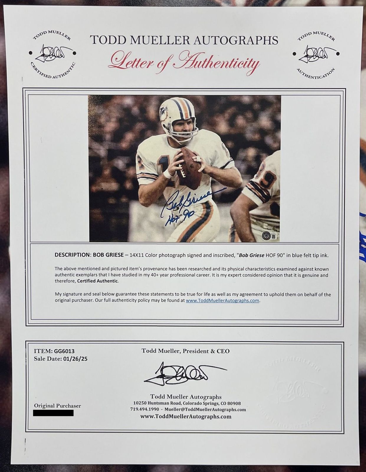 A fantastic glossy 11x14 photo hand-signed by football legend Bob Griese. It comes with a lifetime guarantee of authenticity COA. All of our items are guaranteed authentic for life and are backed by our 20+ years in the autograph business. All items are hand-signed; we never sell copies or reproductions of any kind.