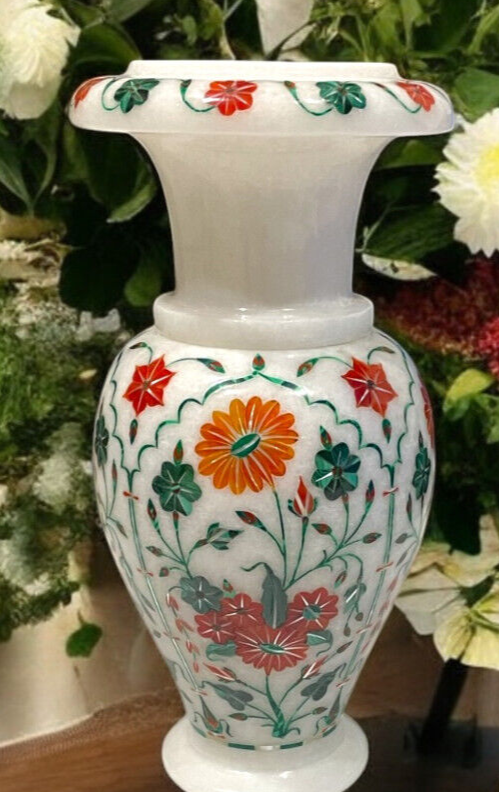 15" White Marble Multi Inlay Stone Semiprecious Flower Pot Unique Home Deco Arts