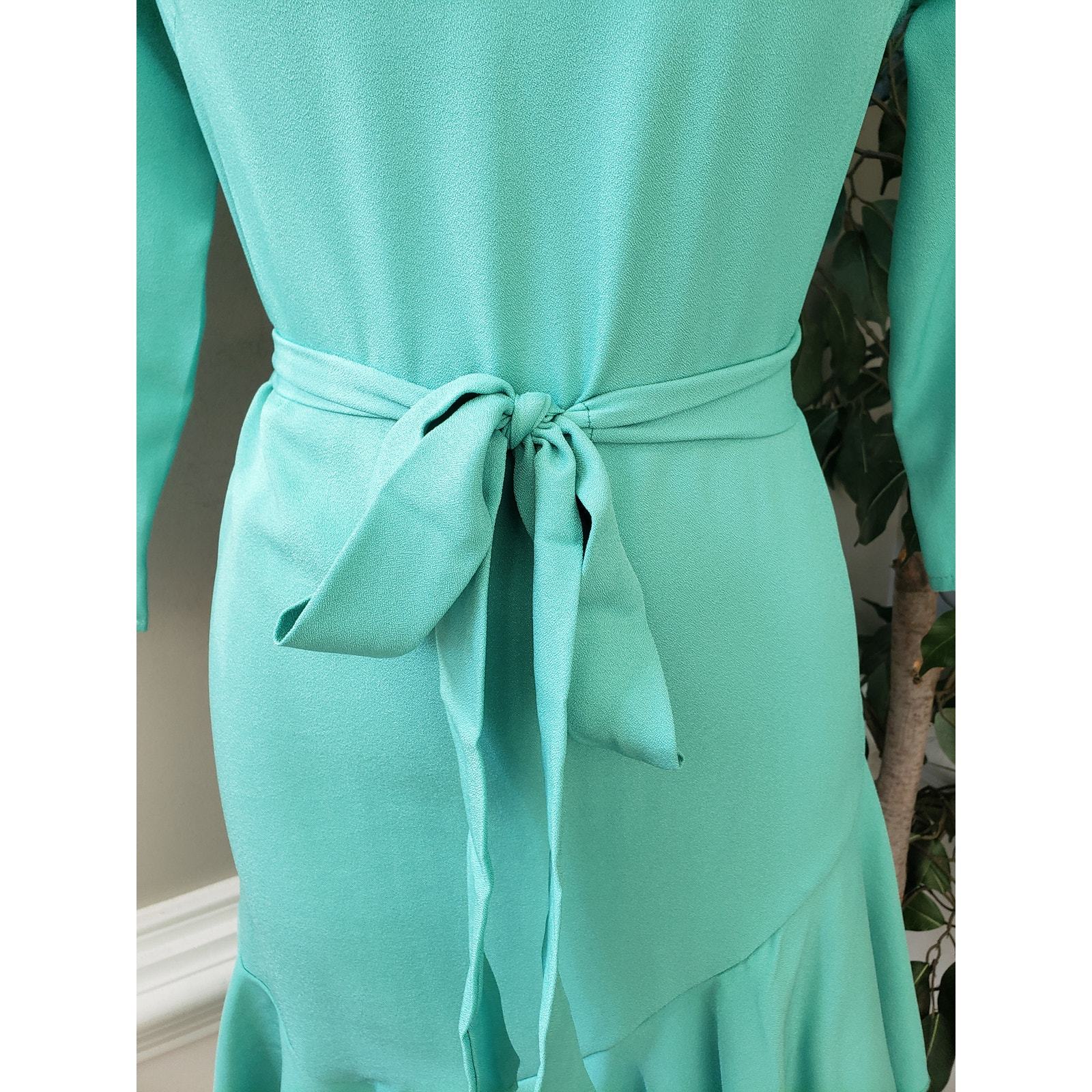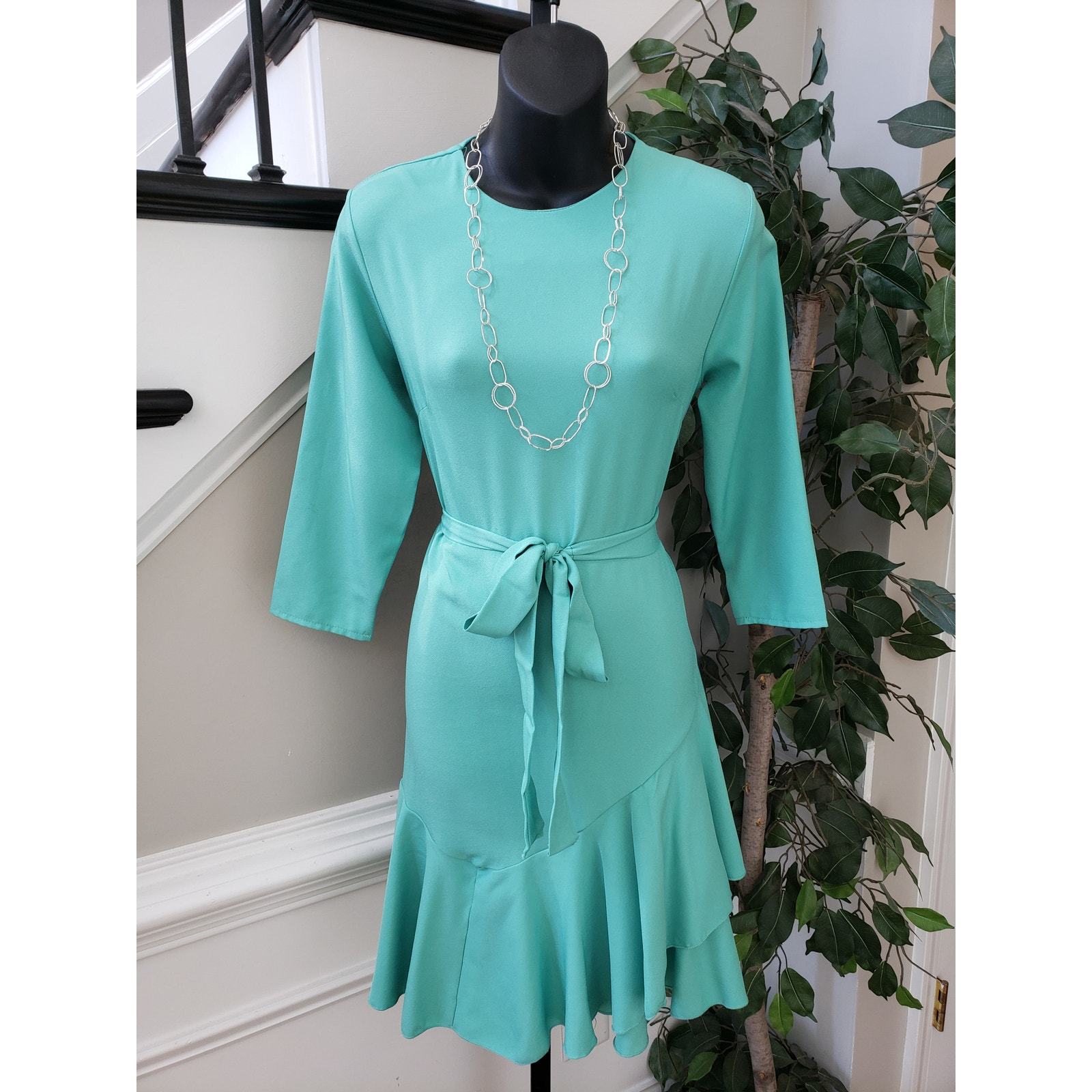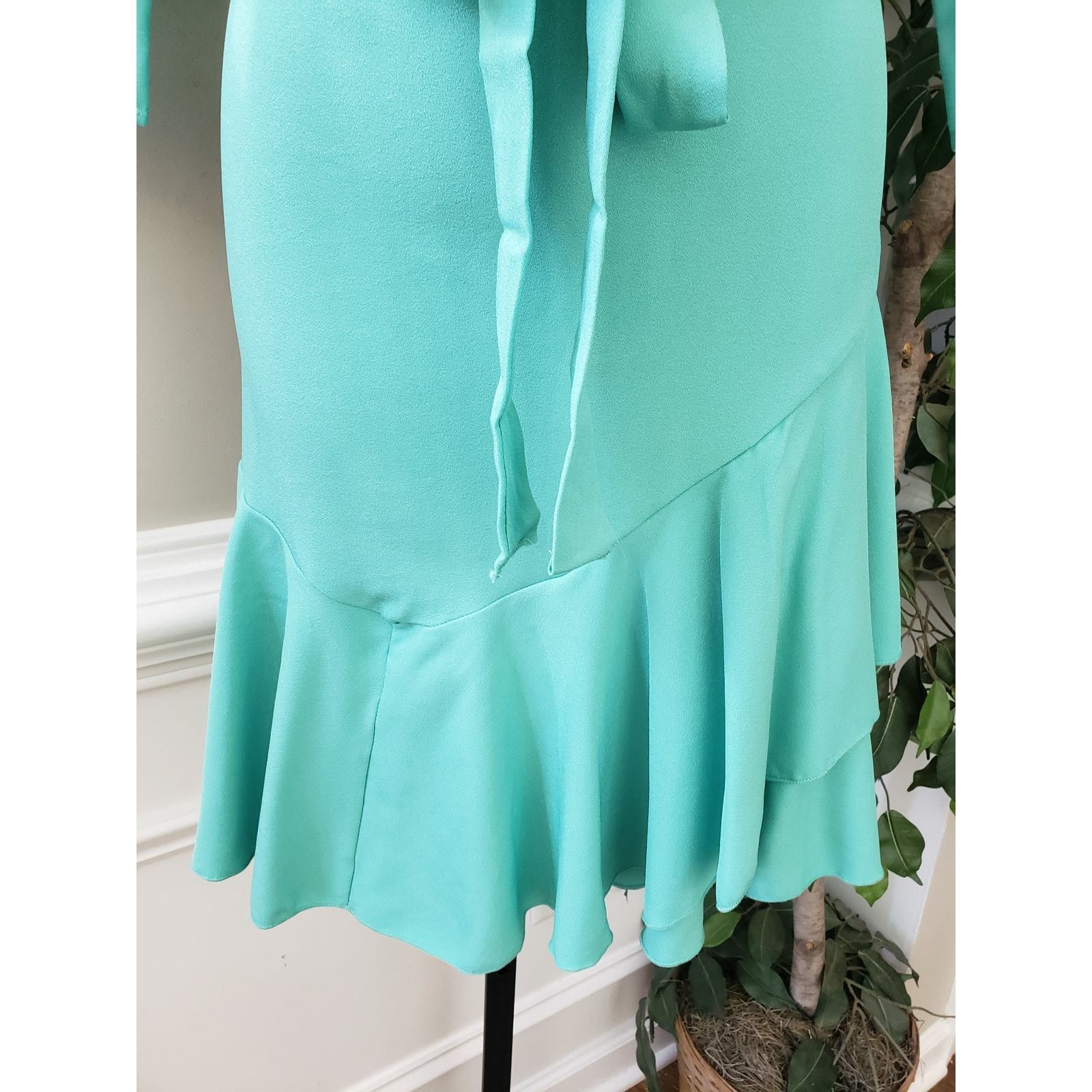 Carole Christian Sheath Dress Womens Small Aqua Crepe Ruffle Hem Tie Front