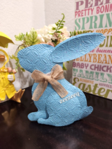 Up for sale is this adorable tabletop decor for your Spring/Easter decor. The cute bunny is a beautiful blue and has a bow on it's neck. Made of some type of metal. It stands approx 9".