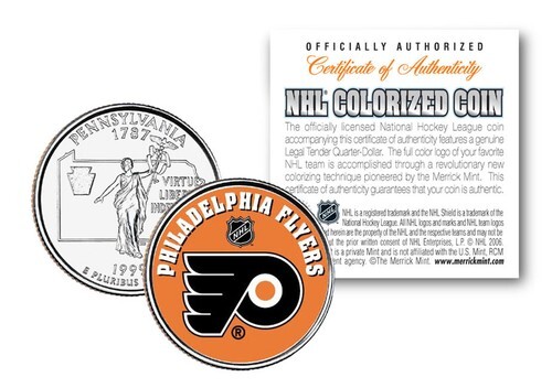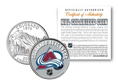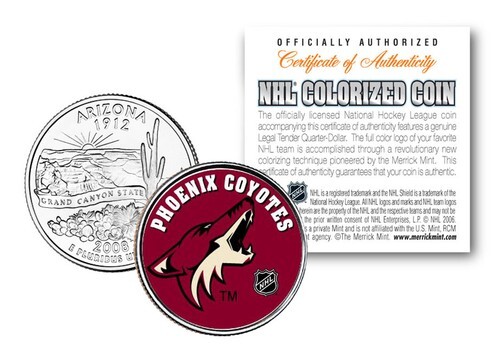 Here is your chance to own an OFFICIALLY LICENSED, beautifully colorized Legal Tender 2002 Tennessee Statehood Quarter U.S. coin that is beautifully colorized with the licensed NHL logo image of your favorite NHL team, the NASHVILLE PREDATORS. Each coin is officially licensed and approved by the National Hockey League (NHL). This uncirculated Genuine Legal Tender Statehood Quarter U.S. Coin has been colorized using a unique multicolor authentic process by the Merrick Mint. Colorizing coins involves the unique application of special inks directly to the surface of a coin using a unique and painstakingly multi-color coin process, that achieves a level of detail, color saturation, and durability that is #1 in the industry. The result is an everlasting colorized coin collectible of ultra-high quality. Each uncirculated coin comes in a premium coin capsule with a NHL Certificate of Authenticity. Each Statehood Quarter coin features an emblematic design of the state on the reverse and colorized NHL team logo image on the obverse (portrait of George Washington design).