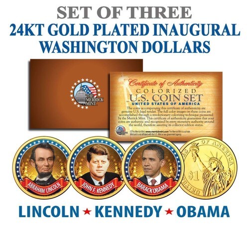 Buy one and get one FREE! Barack Obama is the 44th President of the United States. Here is your opportunity to own or to giftthe ?BARACK OBAMA - 2008? colorized 24 Karat Gold Plated Inaugural George Washington 2007 Presidential $1 U.S. Coin, which has been layered in Genuine 24 Karat Gold, and then beautifully enhanced with colorized images by the Merrick Mint. Each coin comes in a premium coin capsule with a full color Certificate of Authenticity to guarantee that your coin is authentic and recognized by every monetary authority around the world, assuring its Collector Edition status. This Legal Tender United States coin has been colorized with an application of special inks directly to the surface of the coin,using a unique and painstakingly multicolor coin process, which achieves a level of detail, color saturation, and durability that is #1 in the coin industry. The result is an everlasting colorized coin collectible of ultra-high quality. The inaugural George Washington 2007 Presidential $1 U.S. Coin features a Statue of Liberty design on the reverse and a George Washington portrait design on the obverse.