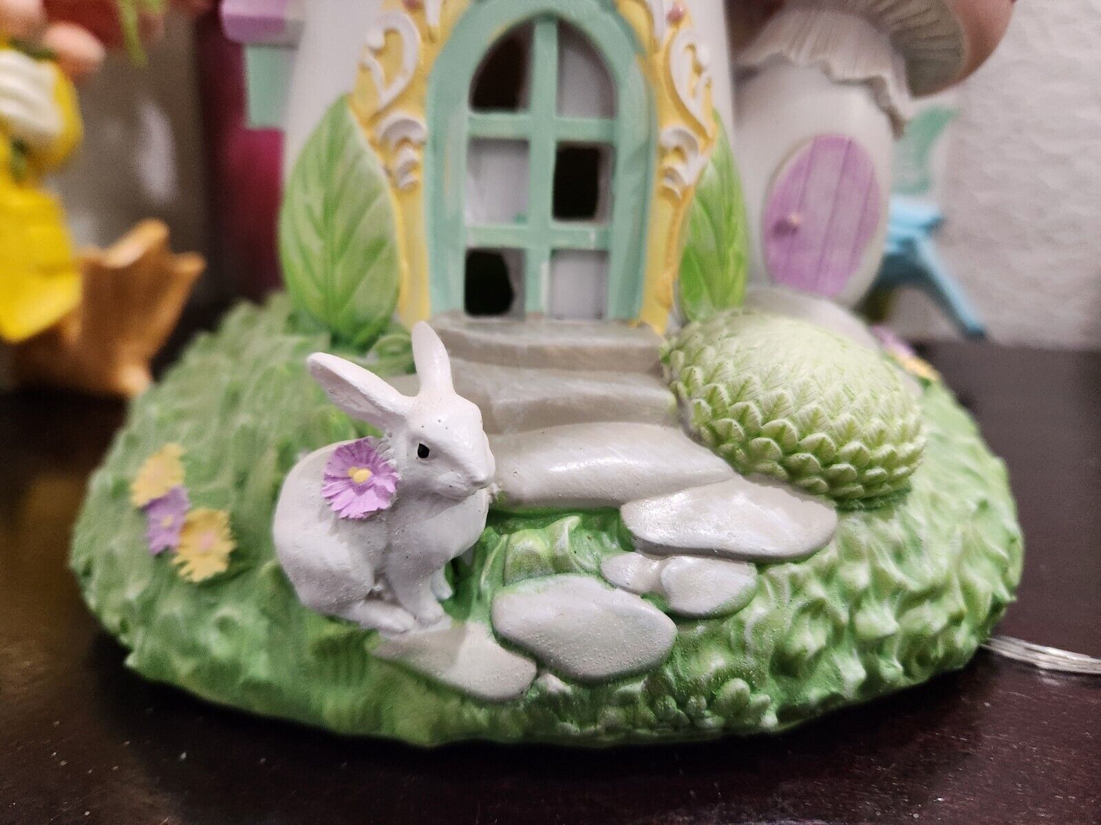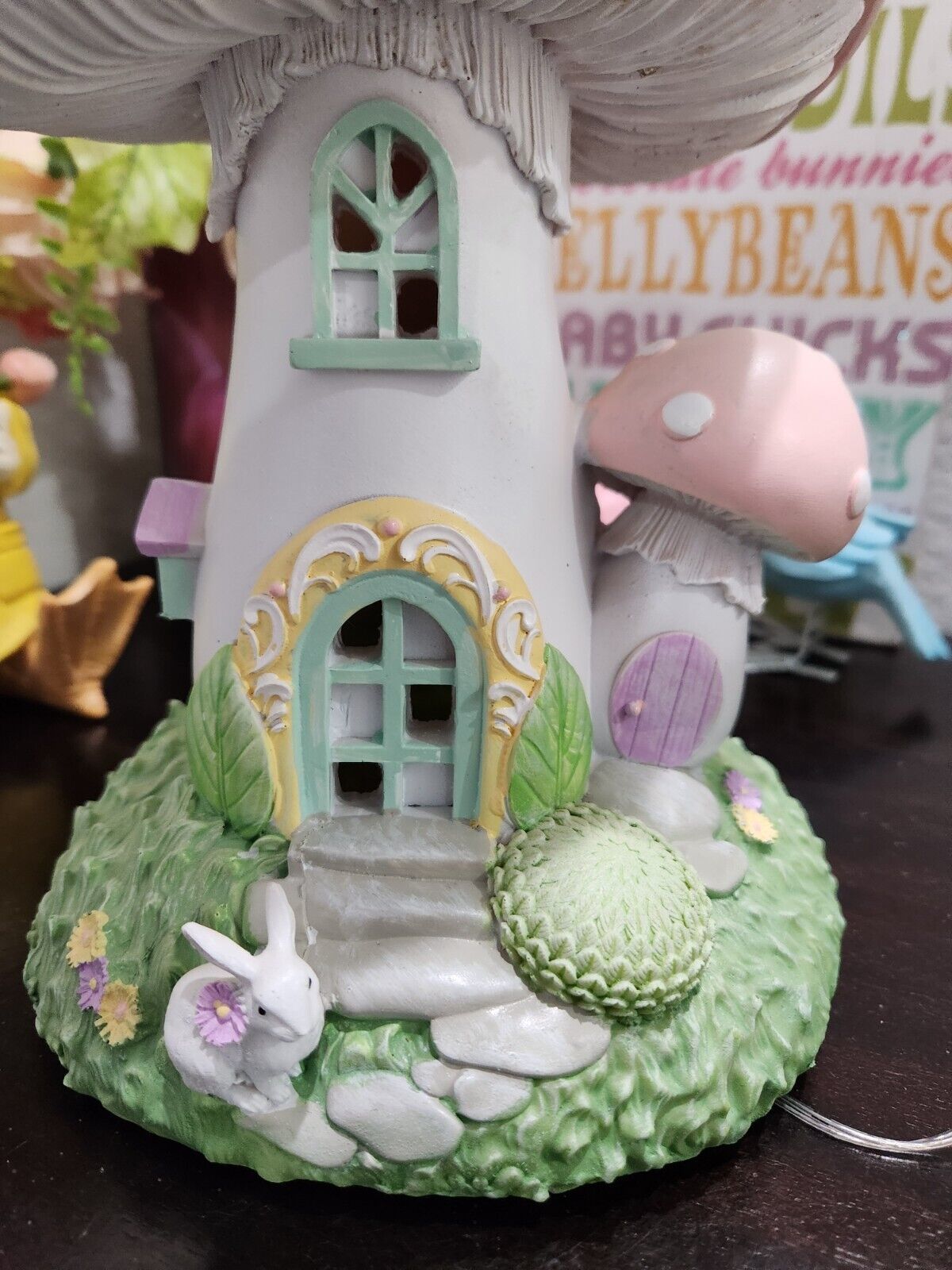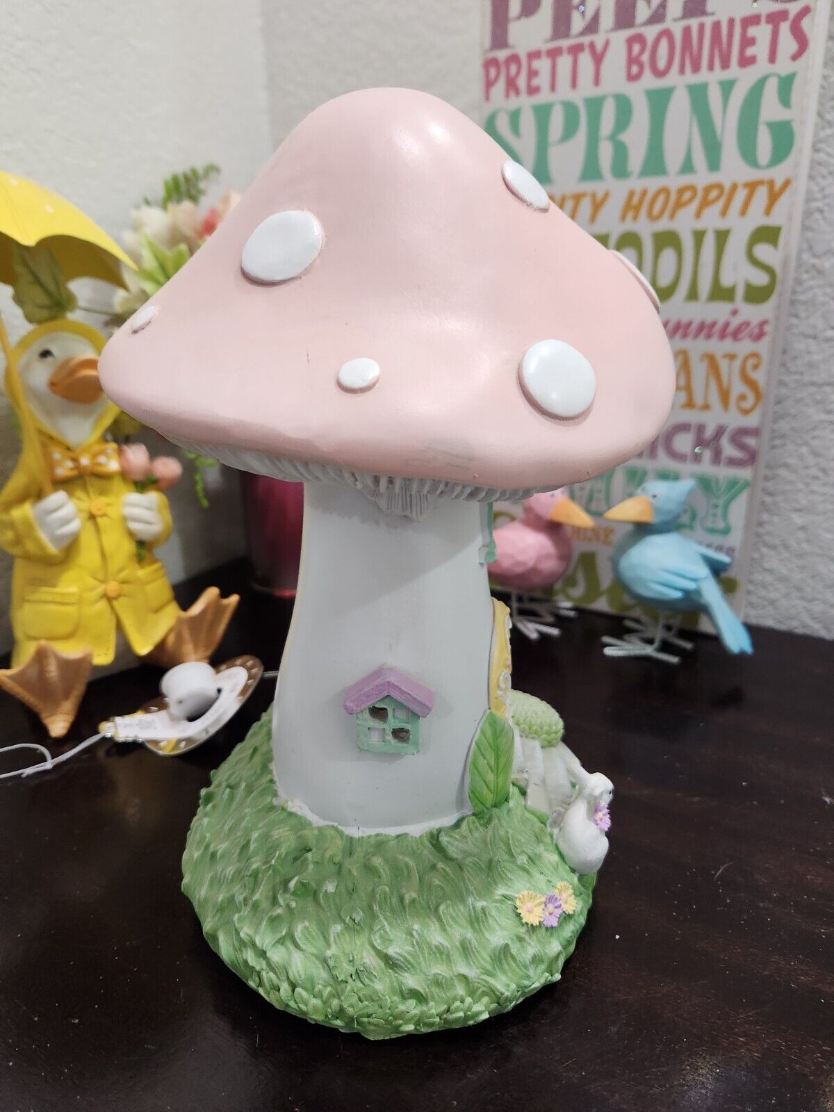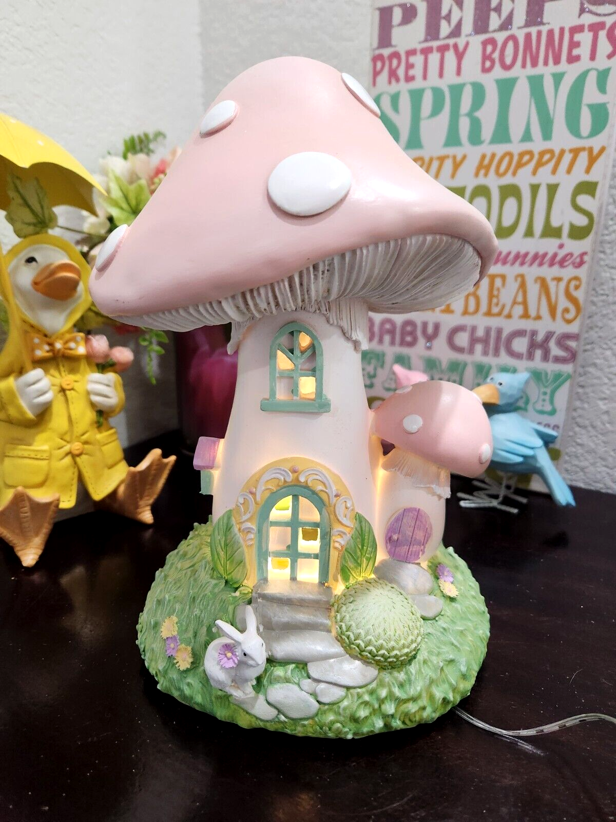 Easter Bunny Rabbit Pink Mushroom House LED LIGHT UP Figurine Figure Decor 10.5"