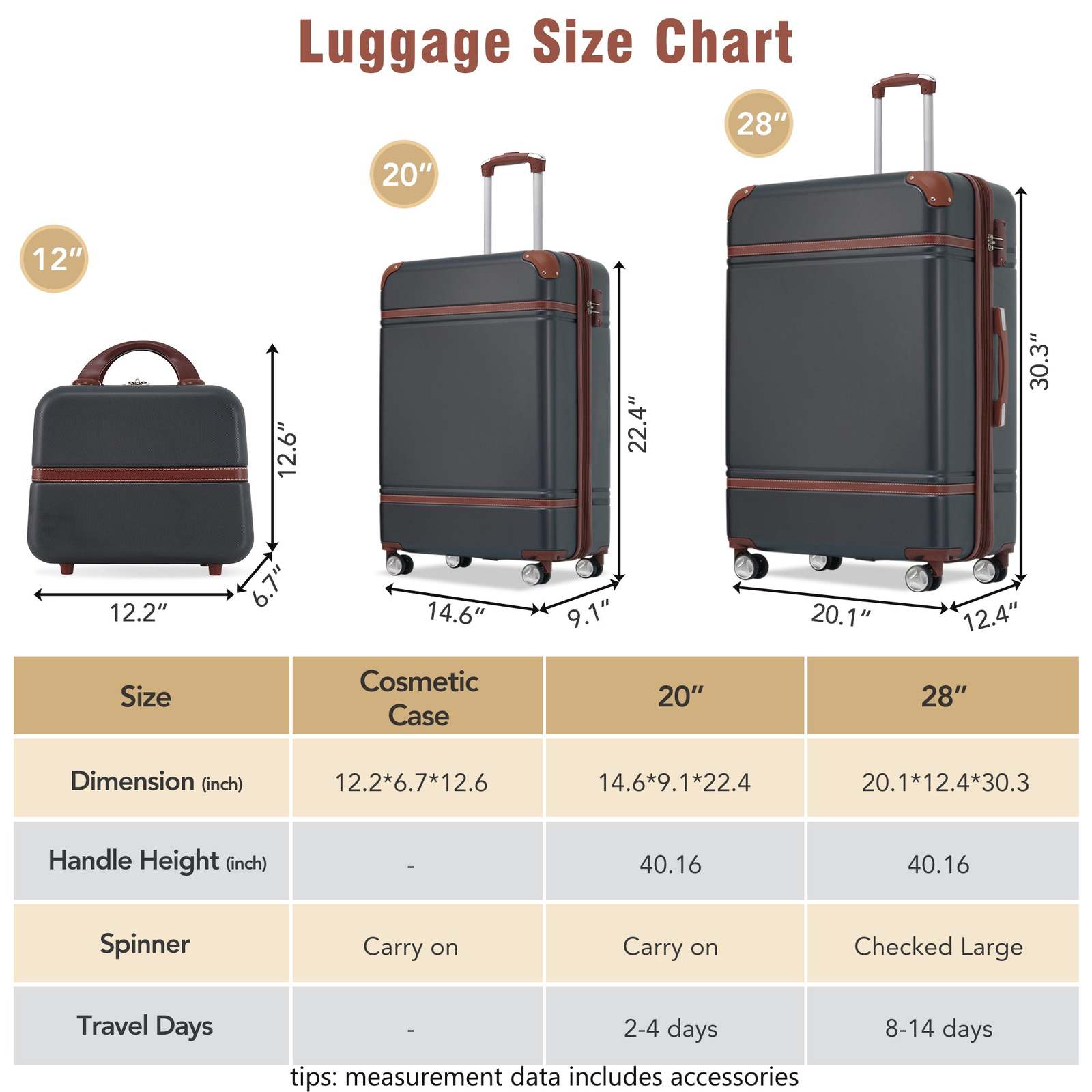 3 Piece Luggage Set Hardside Spinner Suitcase with TSA Lock 20' 28' Available. The 3 pieces set includes Cosmetic Case,20 inches and 28 inches luggages. One set just satisfies all your different travelling needs.