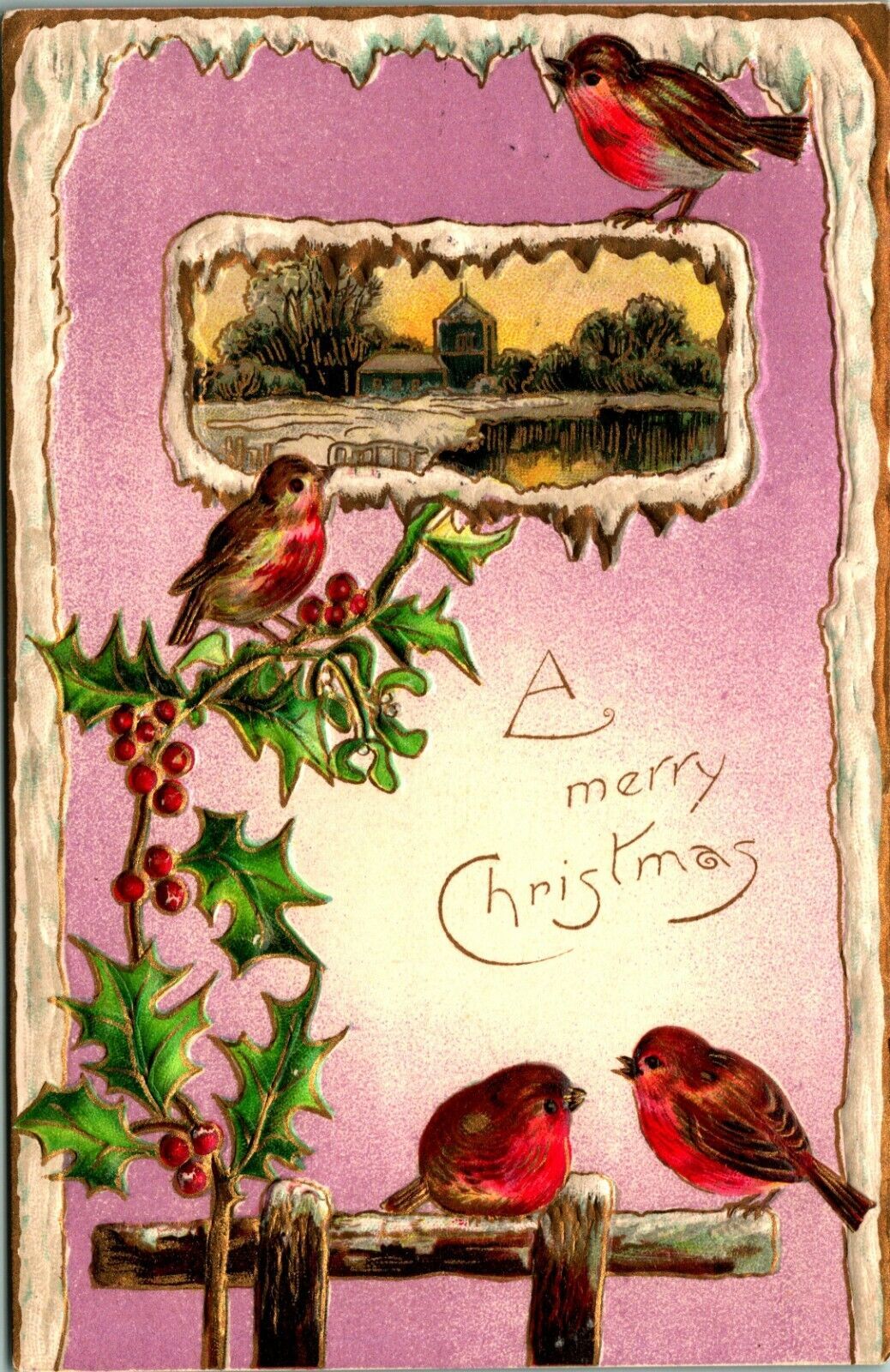 A Merry Christmas Robins Birds Icicle Edge Holly Gilt Embossed 1909 Postcard H31